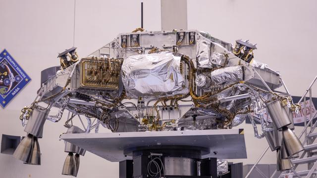 Engineers perform mass properties testing on the rocket-powered descent stage of NASA’s Mars Perseverance rover at Kennedy Space Center on April 12, 2020. The testing to determine the center of gravity, or the point at which weight is evenly dispersed on all sides, was performed inside the Florida spaceport’s Payload Hazardous Servicing Facility. The descent stage will lower the rover through the thin Martian atmosphere and onto the surface on Feb. 18, 2021. Liftoff, aboard a United Launch Alliance Atlas V 541 rocket, is targeted between July 17 and Aug. 5 from Cape Canaveral Air Force Station. NASA’s Launch Services Program based at Kennedy is managing the launch. The rover will seek signs of ancient life and collect rock and soil samples for possible return to Earth.