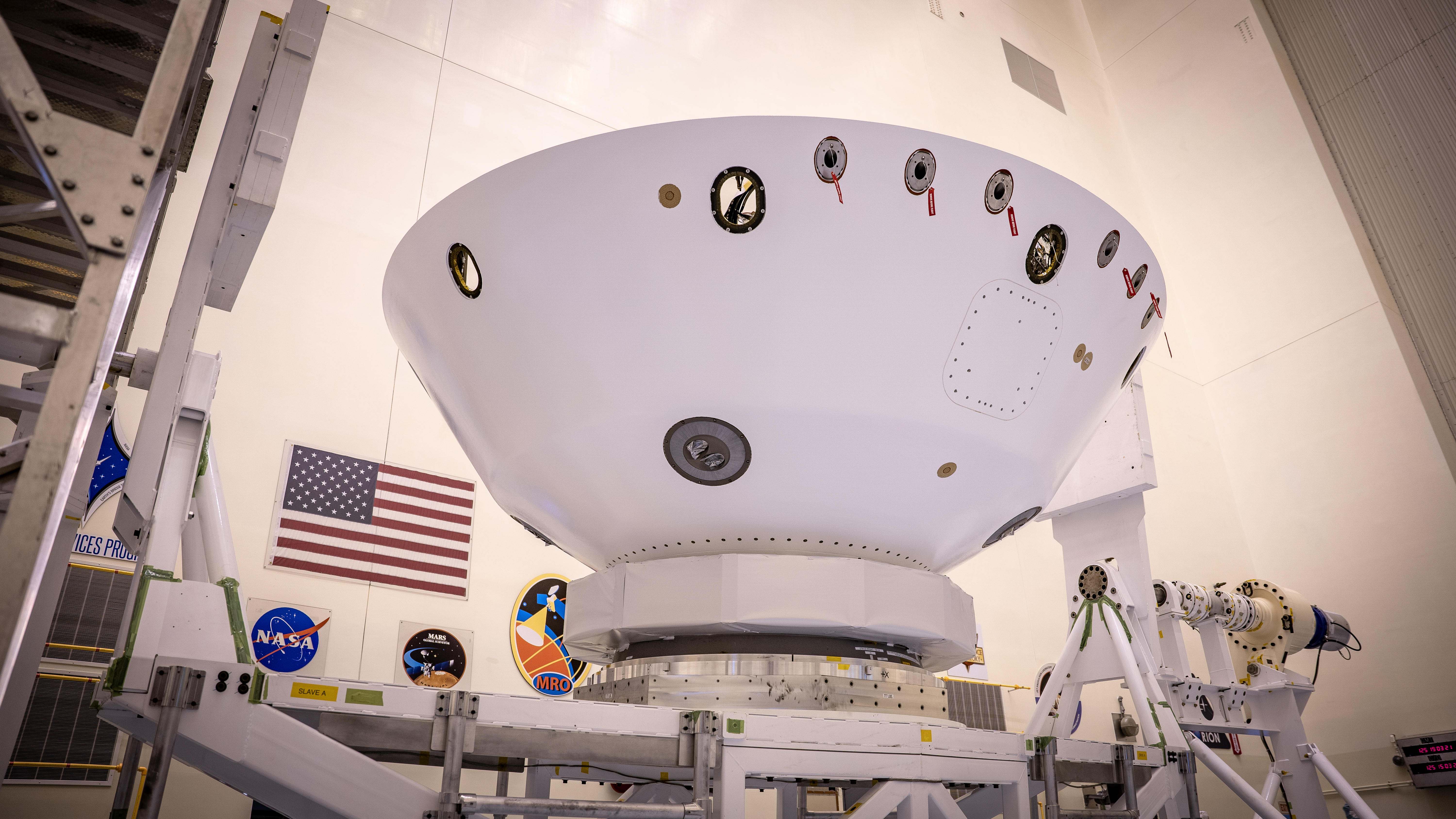Inside the Payload Hazardous Servicing Facility at NASA’s Kennedy Space Center in Florida, the Mars Perseverance rover is rotated to prepare for the Backshell-Powered Descent Vehicle and Entry Vehicle assemblies to be attached on May 4, 2020. The cone-shaped backshell contains the parachute, and along with the mission’s heat shield, provides protection for the rover and descent stage during Martian atmospheric entry. The Mars Perseverance rover is scheduled to launch in mid-July atop a United Launch Alliance Atlas V 541 rocket from Pad 41 at nearby Cape Canaveral Air Force Station. The rover is part of NASA’s Mars Exploration Program, a long-term effort of robotic exploration of the Red Planet. The rover will search for habitable conditions in the ancient past and signs of past microbial life on Mars. The Launch Services Program at Kennedy is responsible for launch management.