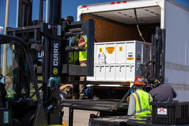 Workers use a special handling device to offload the Adaptive Caching Assembly (ACA) for NASA’s Mars Perseverance rover from the agency’s C-130 aircraft at Kennedy Space Center’s Launch and Landing Facility in Florida on May 11, 2020. The ACA consists of seven motors and more than 3,000 parts, all working in unison to collect samples from the surface of Mars. A chief component of the assembly is the Sample Handling Arm, which will move sample tubes to the main robotic arm's coring drill and then transfer the filled sample tubes into a space to be sealed and stored. The Mars Perseverance rover is scheduled to launch in mid-July atop a United Launch Alliance Atlas V 541 rocket from Pad 41 at nearby Cape Canaveral Air Force Station. The rover is part of NASA’s Mars Exploration Program, a long-term effort of robotic exploration of the Red Planet. The rover will search for habitable conditions in the ancient past and signs of past microbial life on Mars. The Launch Services Program at Kennedy is responsible for launch management.