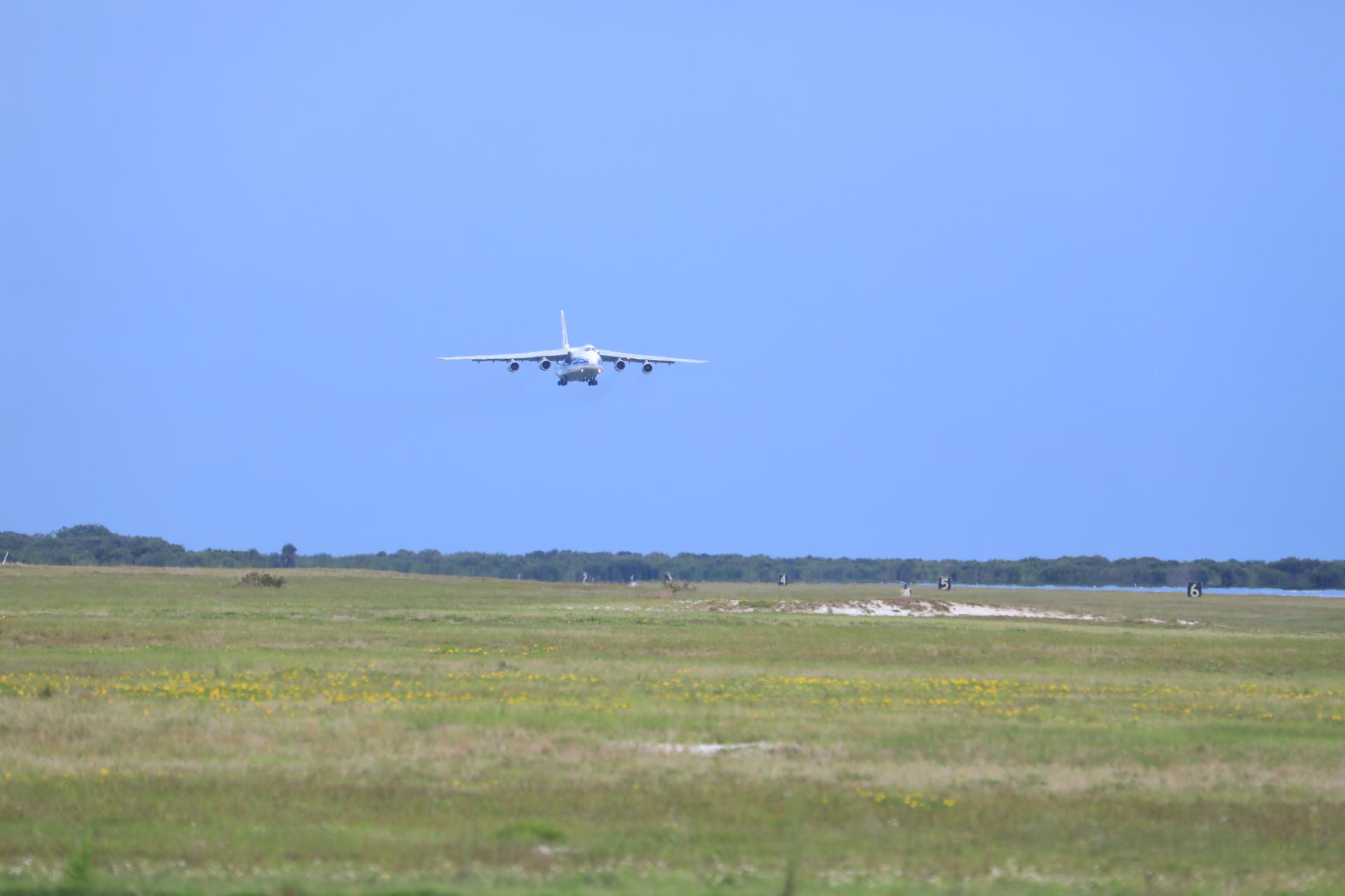 The Antonov 124 cargo aircraft, carrying the United Launch Alliance booster for NASA’s Mars Perseverance rover, descends toward the Skid Strip at Cape Canaveral Air Force Station (CCAFS) in Florida on May 18, 2020. The Mars Perseverance rover is scheduled to launch in mid-July atop a United Launch Alliance Atlas V 541 rocket from Pad 41 at CCAFS. The rover is part of NASA’s Mars Exploration Program, a long-term effort of robotic exploration of the Red Planet. The rover will search for habitable conditions in the ancient past and signs of past microbial life on Mars. The Launch Services Program at Kennedy is responsible for launch management.