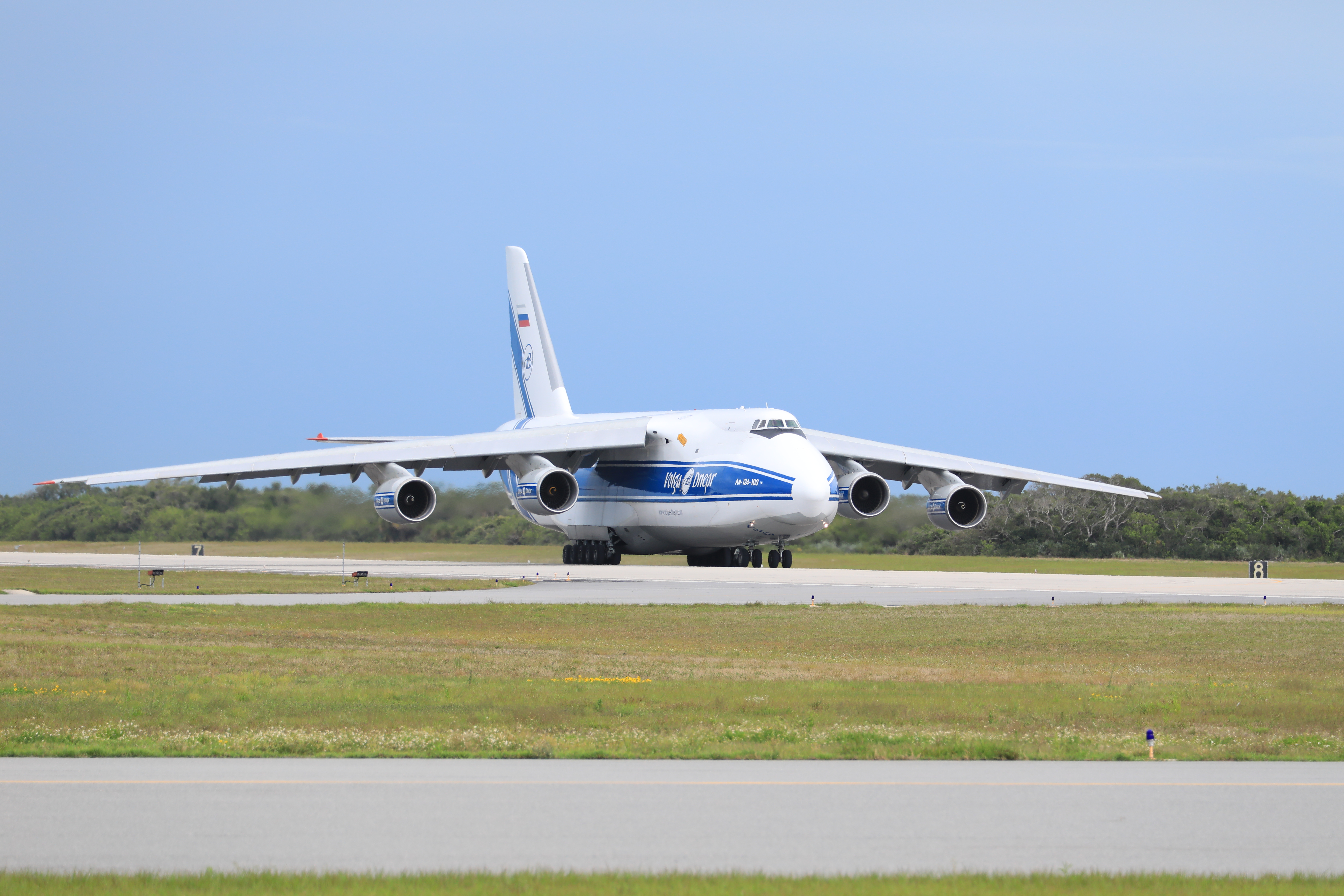 The Antonov 124 cargo aircraft, carrying the United Launch Alliance booster for NASA’s Mars Perseverance rover, touches down on the Skid Strip at Cape Canaveral Air Force Station (CCAFS) in Florida on May 18, 2020. The Mars Perseverance rover is scheduled to launch in mid-July atop a United Launch Alliance Atlas V 541 rocket from Pad 41 at CCAFS. The rover is part of NASA’s Mars Exploration Program, a long-term effort of robotic exploration of the Red Planet. The rover will search for habitable conditions in the ancient past and signs of past microbial life on Mars. The Launch Services Program at Kennedy is responsible for launch management.