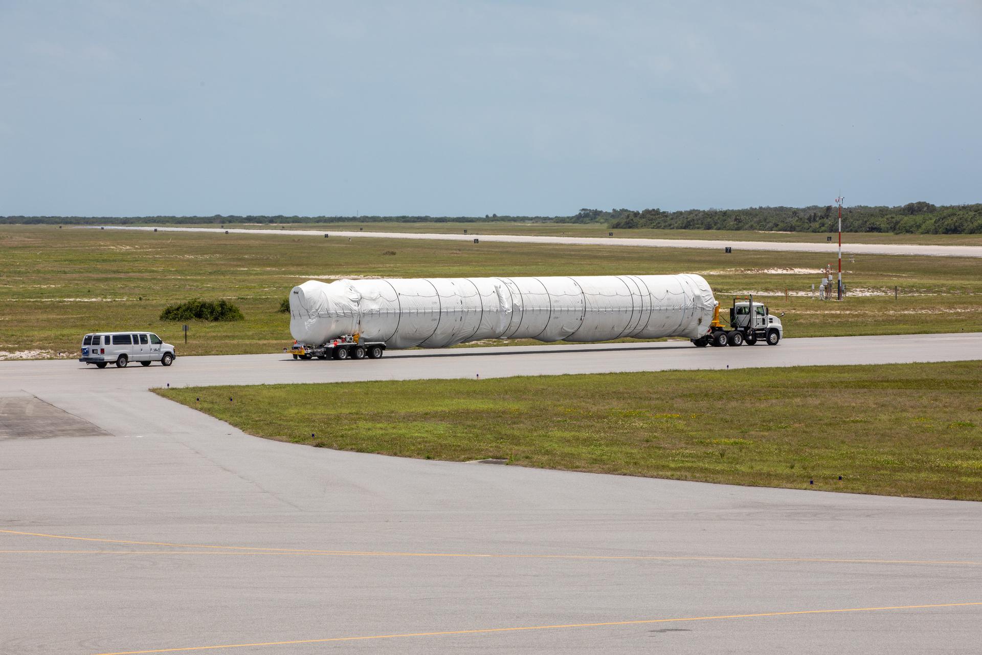 A flatbed truck carrying the United Launch Alliance booster for NASA’s Mars Perseverance rover departs the Skid Strip at Cape Canaveral Air Force Station (CCAFS) in Florida on May 19, 2020. The booster arrived aboard the Antonov 124 cargo aircraft at the Skid Strip on May 18, 2020. The Mars Perseverance rover is scheduled to launch in mid-July atop a United Launch Alliance Atlas V 541 rocket from Pad 41 at CCAFS. The rover is part of NASA’s Mars Exploration Program, a long-term effort of robotic exploration of the Red Planet. The rover will search for habitable conditions in the ancient past and signs of past microbial life on Mars. The Launch Services Program at Kennedy is responsible for launch management.