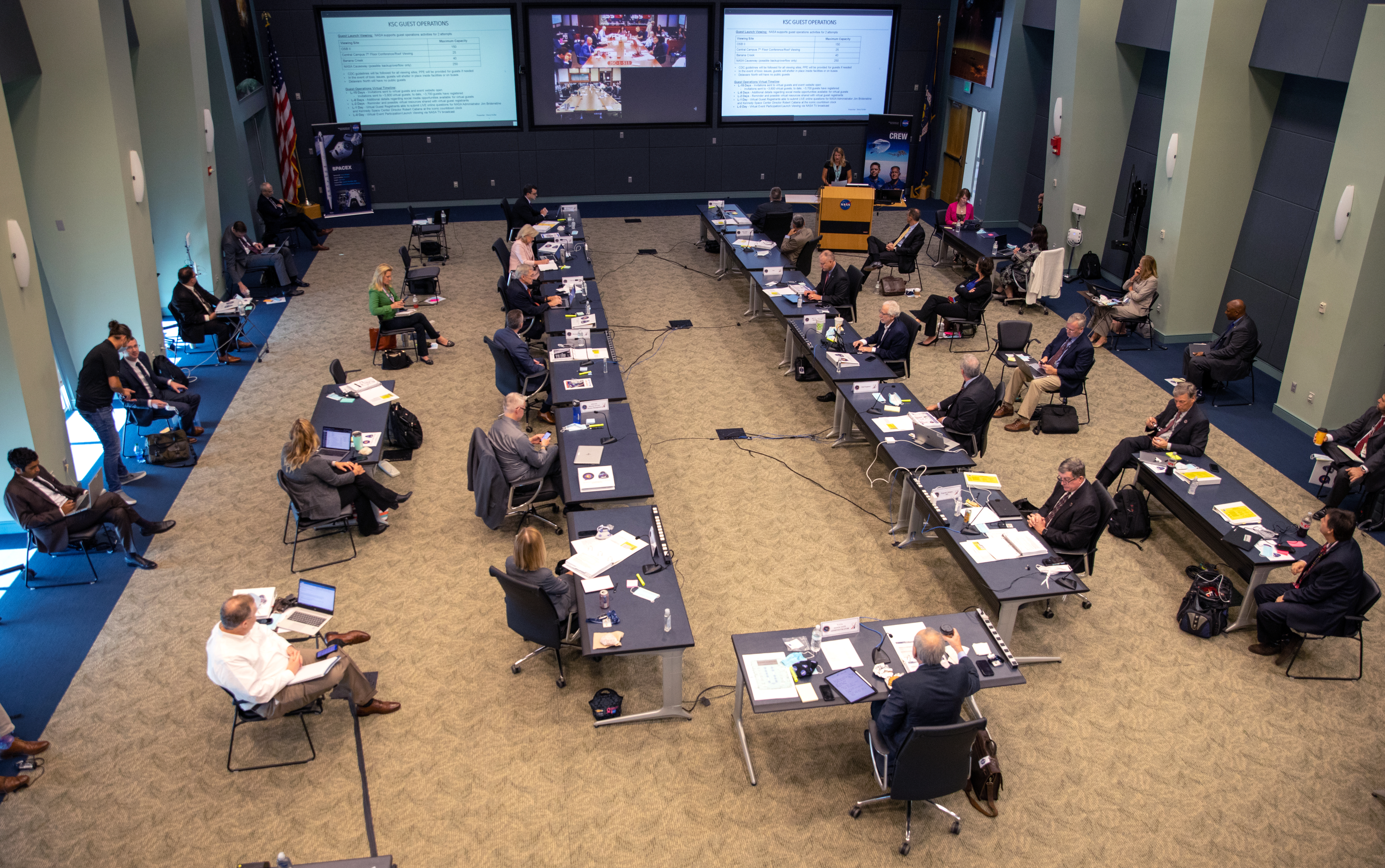 On May 21, 2020, inside the Operations Support Building II at NASA’s Kennedy Space Center in Florida, NASA and SpaceX managers participate in a flight readiness review for the upcoming Demo-2 launch. A SpaceX Falcon 9 rocket and Crew Dragon spacecraft will carry NASA astronauts Robert Behnken and Douglas Hurley to the International Space Station as part of the agency’s Commercial Crew Program, returning human spaceflight capability to the U.S. after nearly a decade. Launch is slated for 4:33 p.m. EDT on Wednesday, May 27, from Kennedy’s Launch Complex 39A.