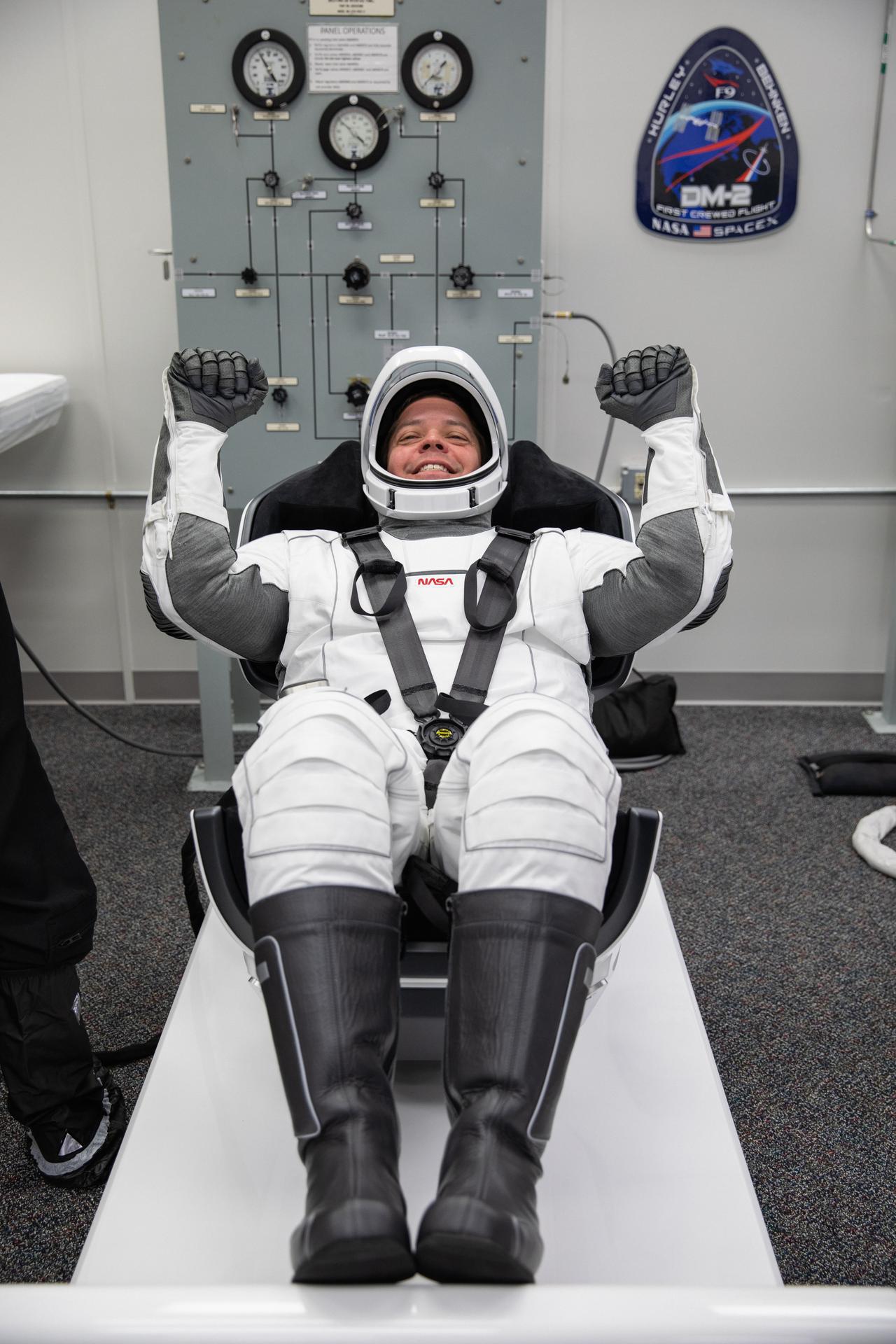 NASA astronaut Robert Behnken rehearses putting on his SpaceX spacesuit in the Astronaut Crew Quarters inside the Neil A. Armstrong Operations and Checkout Building at the agency’s Kennedy Space Center in Florida on May 23, 2020, during a full dress rehearsal ahead of NASA’s SpaceX Demo-2 mission to the International Space Station. This will be SpaceX’s final flight test for NASA’s Commercial Crew Program. Behnken and fellow crew member Douglas Hurley will fly to the orbiting laboratory in a SpaceX Crew Dragon spacecraft, launching atop a Falcon 9 rocket from Kennedy’s Launch Complex 39A. Liftoff is scheduled for 4:33 p.m. EDT on Wednesday, May 27.