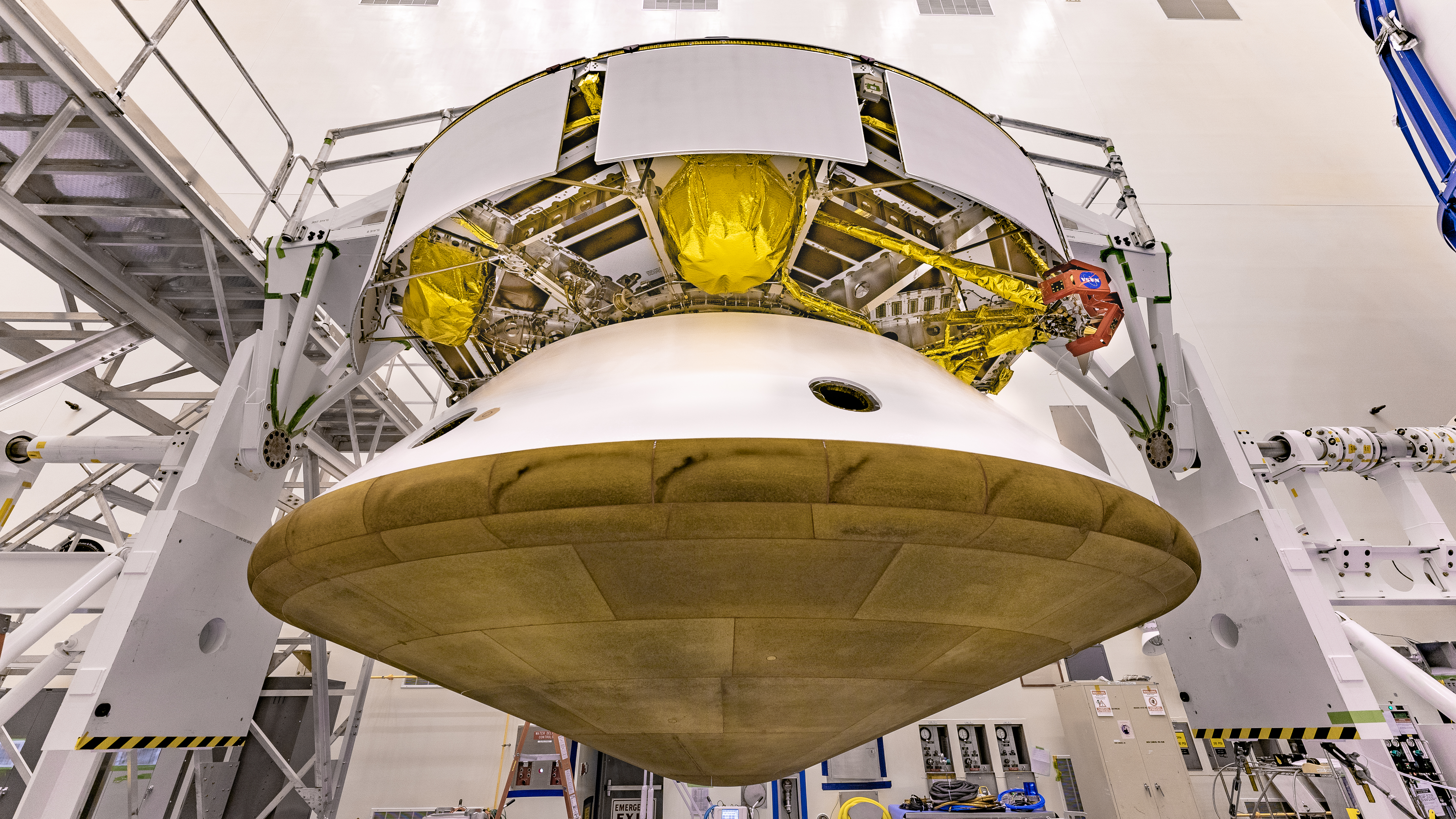 Inside the Payload Hazardous Servicing Facility at NASA’s Kennedy Space Center in Florida, the Backshell-Powered Descent Vehicle and Entry Vehicle assemblies are being attached to the Mars Perseverance rover on May 28, 2020. The cone-shaped backshell contains the parachute, and along with the mission’s heat shield, provides protection for the rover and descent stage during Martian atmospheric entry. The Mars Perseverance rover is scheduled to launch on July 20 atop a United Launch Alliance Atlas V 541 rocket from Pad 41 at nearby Cape Canaveral Air Force Station. The rover is part of NASA’s Mars Exploration Program, a long-term effort of robotic exploration of the Red Planet. The rover will search for habitable conditions in the ancient past and signs of past microbial life on Mars. The Launch Services Program at Kennedy is responsible for launch management.