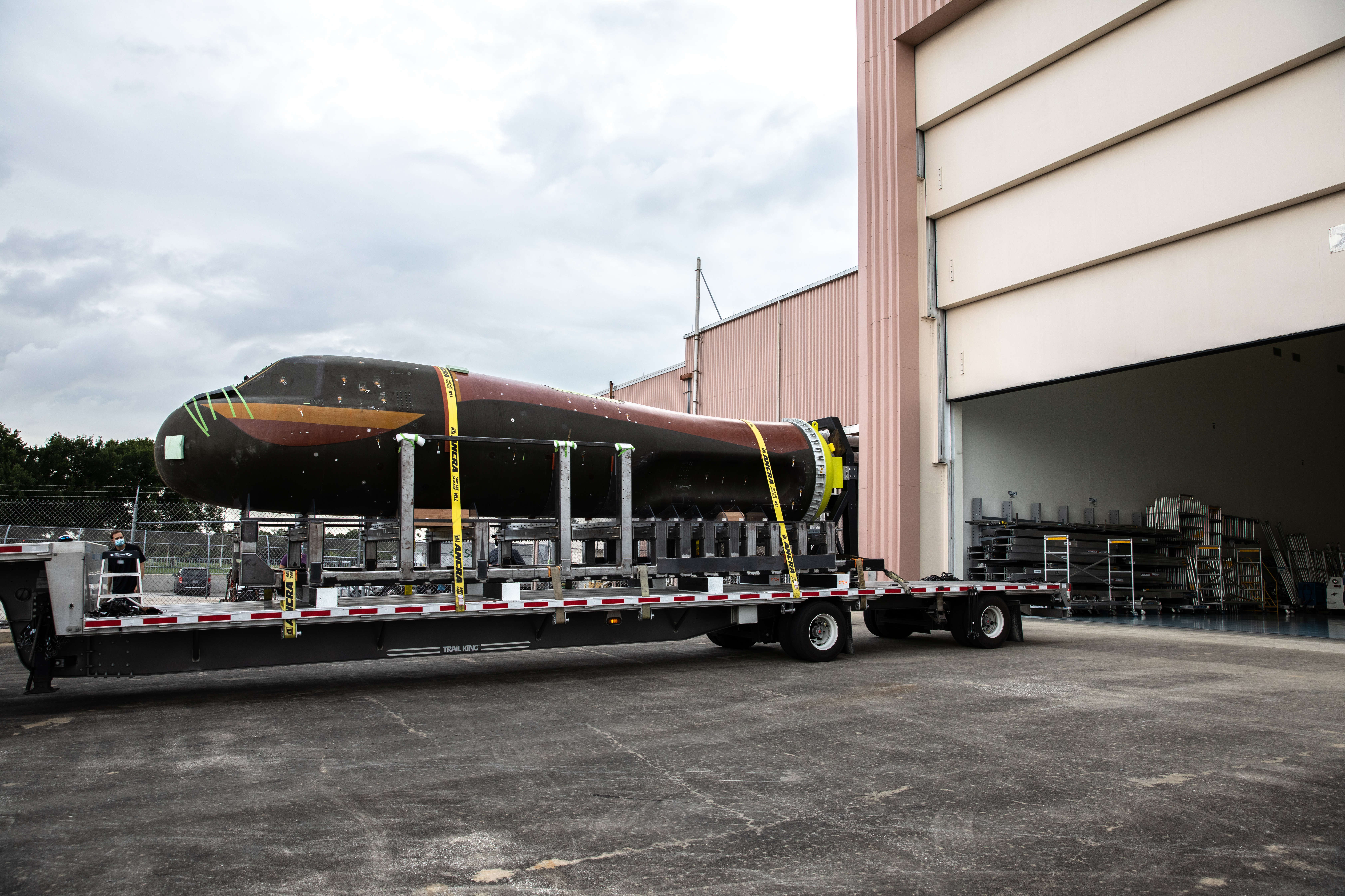 Sierra Nevada Corporation’s (SNC) Dream Chaser pressure test article arrives by flatbed truck at the Space Station Processing Facility at NASA’s Kennedy Space Center in Florida on June 3, 2020, from Louisville, Colorado. The test article is similar to the actual pressurized cabin being used in the Dream Chaser spaceplane for Commercial Resupply Services-2 (CRS-2) missions. NASA selected Dream Chaser to provide cargo delivery, return and disposal service for the International Space Station under the CRS-2 contract. The test article will remain at Kennedy while SNC engineers use it to develop and verify refurbishment operations that will be used on Dream Chaser between flights.
