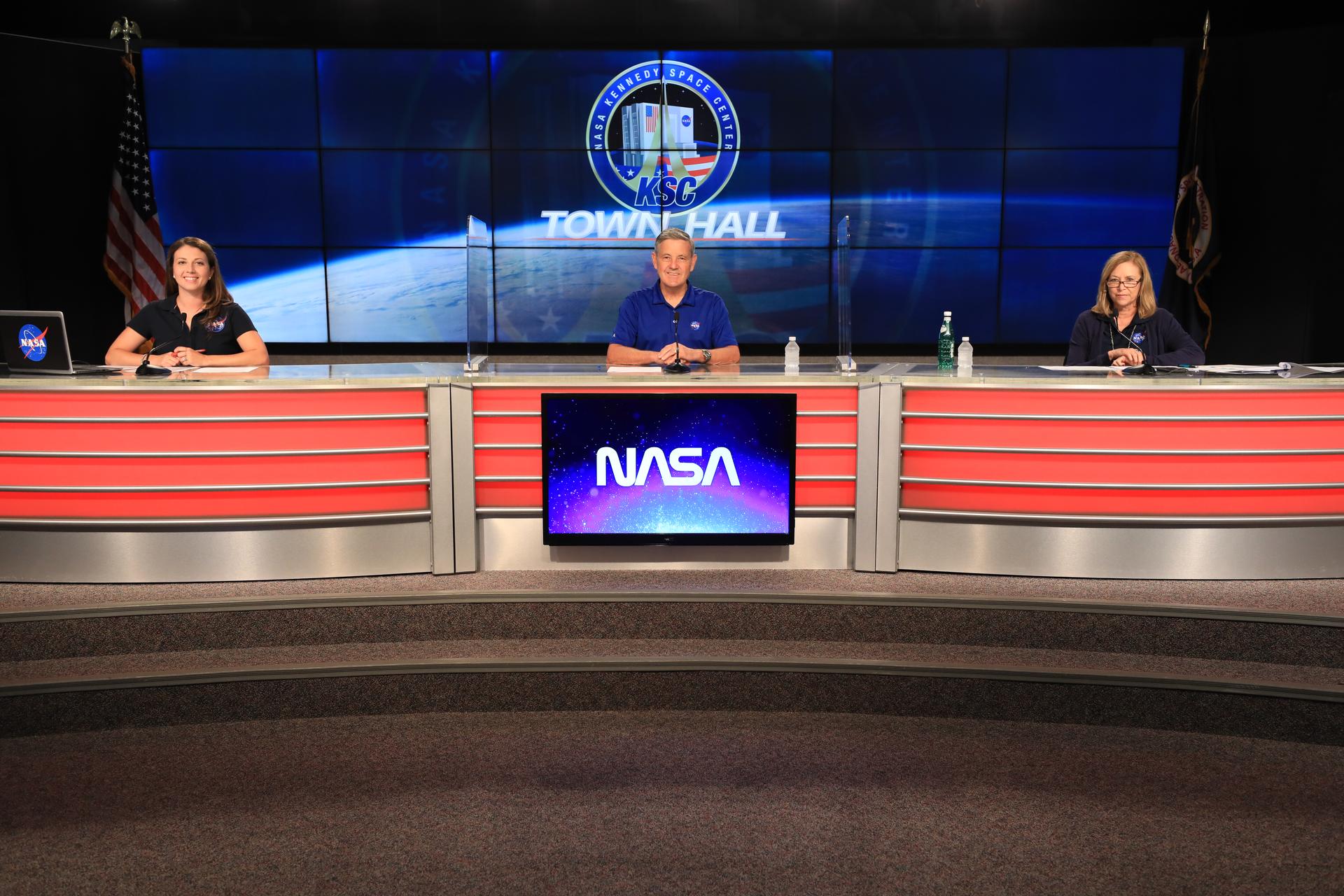 Members of NASA Kennedy Space Center leadership hold a virtual town hall at the Florida spaceport’s Press Site auditorium on June 10, 2020, to share the plan for employees to safely return to on-site work during the time of COVID-19. From left to right are event moderator Marie Lewis of NASA Communications, Center Director Bob Cabana and Deputy Director Janet Petro. Also participating was Dr. David Tipton, chief medical officer, not pictured.