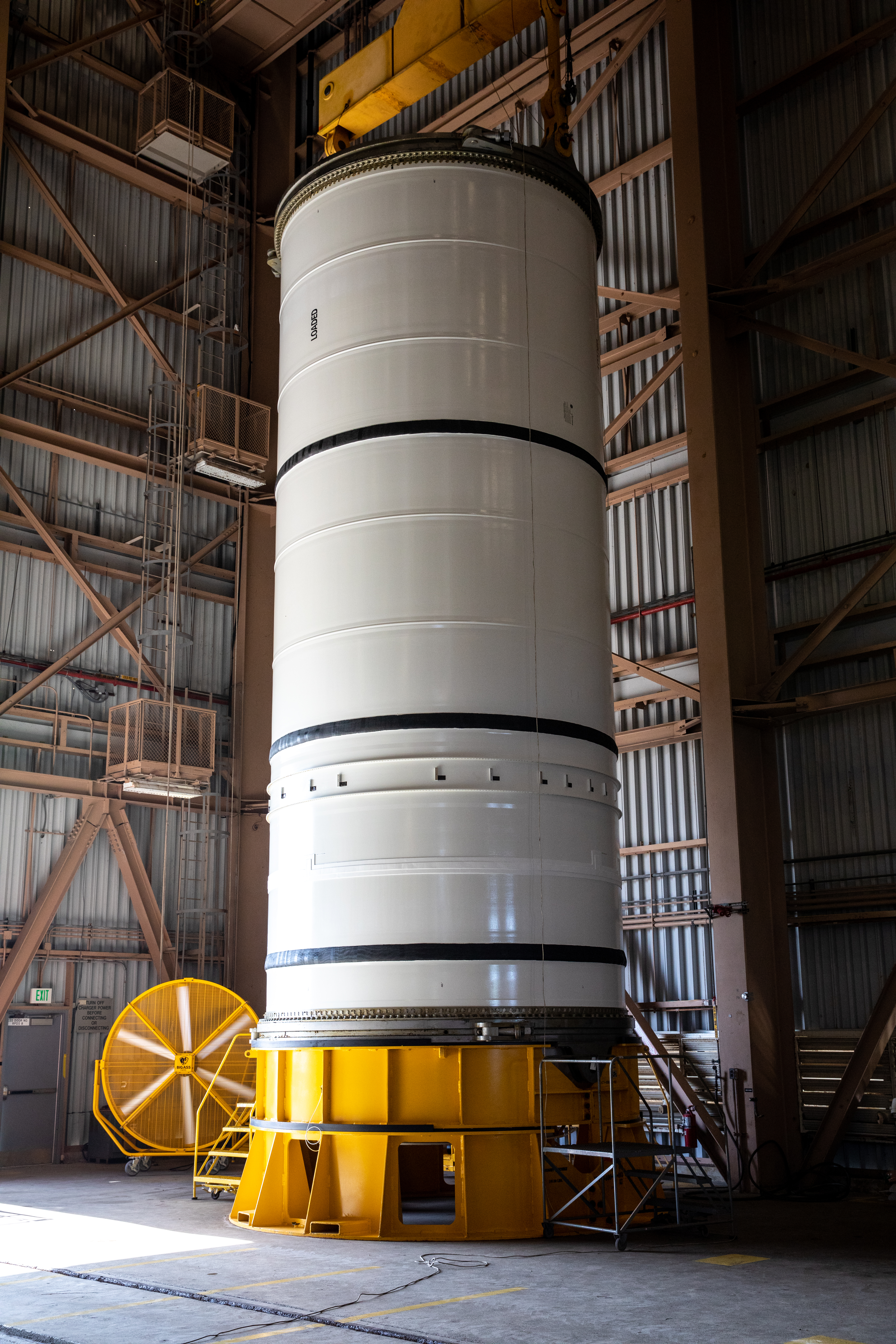 Inside the Rotation, Processing and Surge Facility at NASA’s Kennedy Space Center in Florida, the right-hand motor segment – one of five segments that make up one of two solid rocket boosters for the agency’s Space Launch System (SLS) – is prepped for mating to the rocket’s right-hand aft skirt on June 24, 2020. Once the booster aft segments are mated to the two aft skirts, they will be moved to the Vehicle Assembly Building for stacking on the mobile launcher. Manufactured by Northrop Grumman in Utah, the twin boosters provide more than 75 percent of the total SLS thrust at launch. Under the Artemis program, NASA will land the first woman and the next man on the Moon by 2024. The first in a series of increasingly complex missions, Artemis I will test the Orion spacecraft and SLS as an integrated system ahead of crewed flights to the Moon.