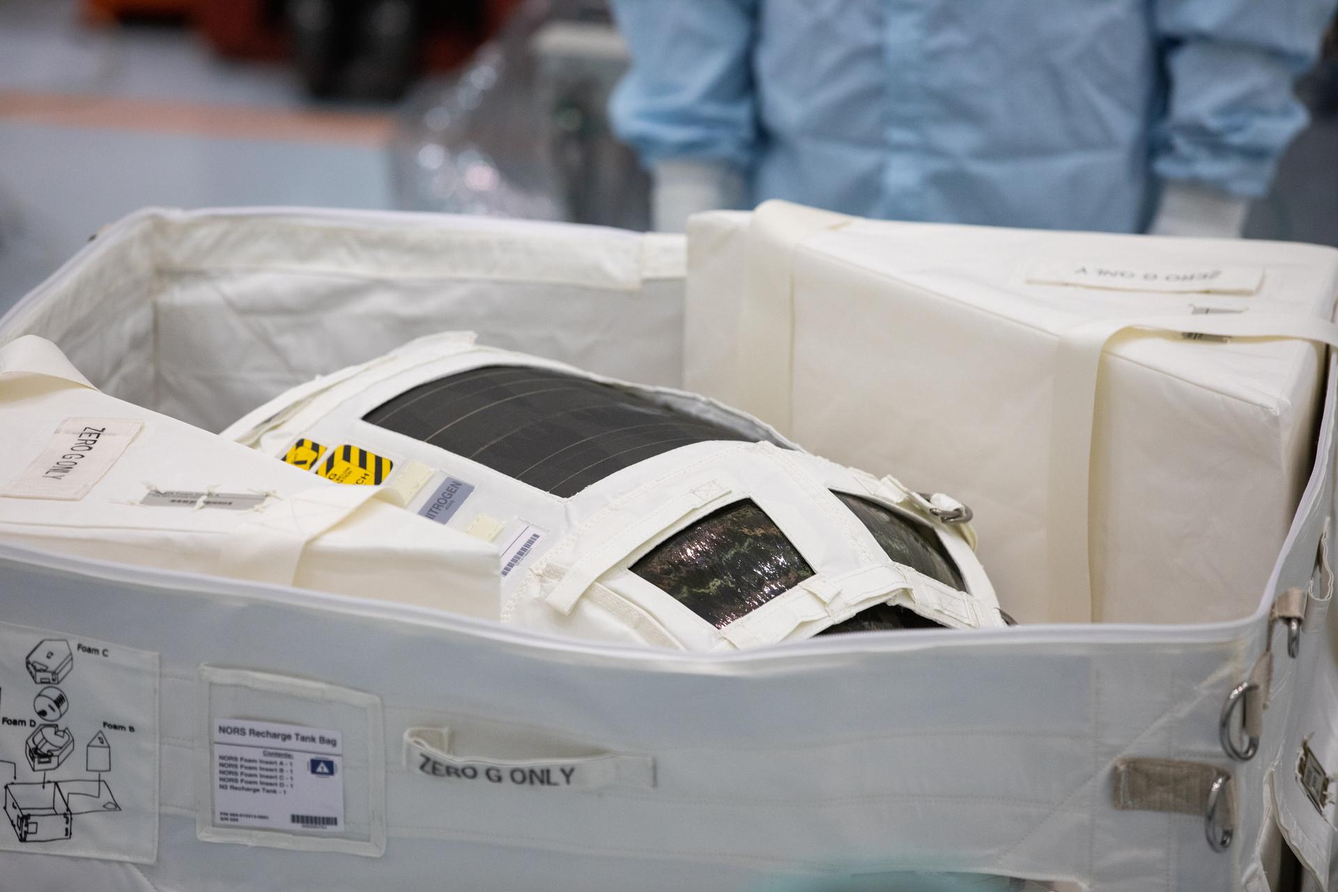 A Nitrogen/Oxygen Recharge System (NORS) tank is unpacked and readied for inspection inside the Space Station Processing Facility high bay at NASA’s Kennedy Space Center in Florida on July 16, 2020. The NORS tanks and their support fixtures are designed to connect to the International Space Station’s existing air supply network to refill the previous generation of tanks installed during construction of the space station. These reusable tanks measure 3 feet long and 21 inches in diameter, and weigh about 200 pounds when filled. Once onboard, the tanks will be used to fill the oxygen and nitrogen tanks that supply the needed gases to the space station’s airlock for spacewalks. They could also be used to replenish the atmosphere inside the station. The NORS tanks will launch to the station later in the year on a commercial resupply mission.