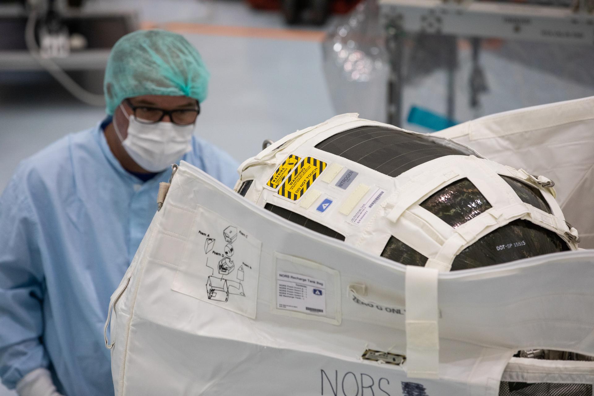 A technicians inspects a Nitrogen/Oxygen Recharge System (NORS) tank inside the Space Station Processing Facility high bay at NASA’s Kennedy Space Center in Florida on July 16, 2020. The NORS tanks and their support fixtures are designed to connect to the International Space Station’s existing air supply network to refill the previous generation of tanks installed during construction of the space station. These reusable tanks measure 3 feet long and 21 inches in diameter, and weigh about 200 pounds when filled. Once onboard, the tanks will be used to fill the oxygen and nitrogen tanks that supply the needed gases to the space station’s airlock for spacewalks. They could also be used to replenish the atmosphere inside the station. The NORS tanks will launch to the station later in the year on a commercial resupply mission.