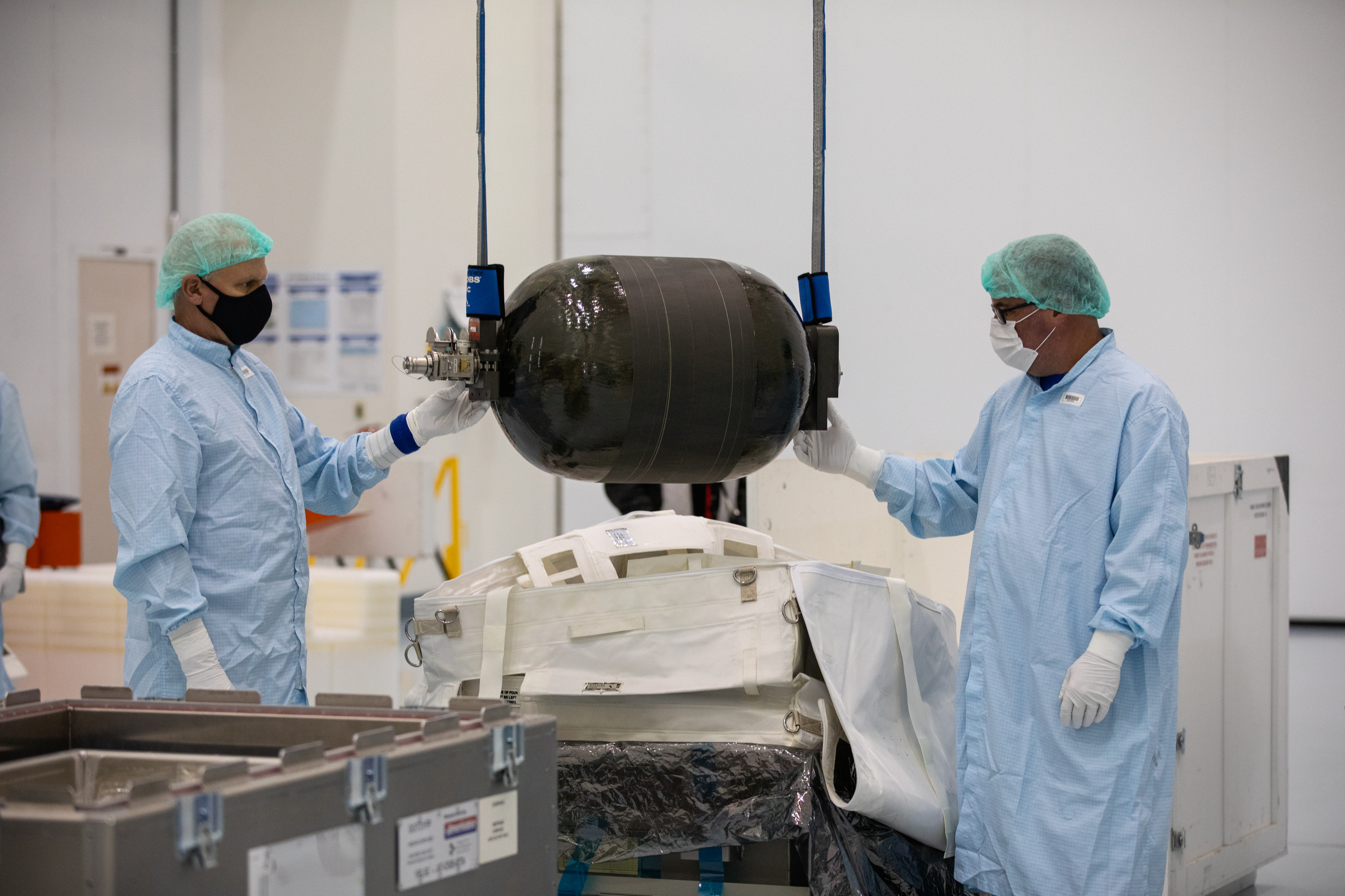 Technicians unpack and inspect a Nitrogen/Oxygen Recharge System (NORS) tank inside the Space Station Processing Facility high bay at NASA’s Kennedy Space Center in Florida on July 16, 2020. The NORS tanks and their support fixtures are designed to connect to the International Space Station’s existing air supply network to refill the previous generation of tanks installed during construction of the space station. These reusable tanks measure 3 feet long and 21 inches in diameter, and weigh about 200 pounds when filled. Once onboard, the tanks will be used to fill the oxygen and nitrogen tanks that supply the needed gases to the space station’s airlock for spacewalks. They could also be used to replenish the atmosphere inside the station. The NORS tanks will launch to the station later in the year on a commercial resupply mission.