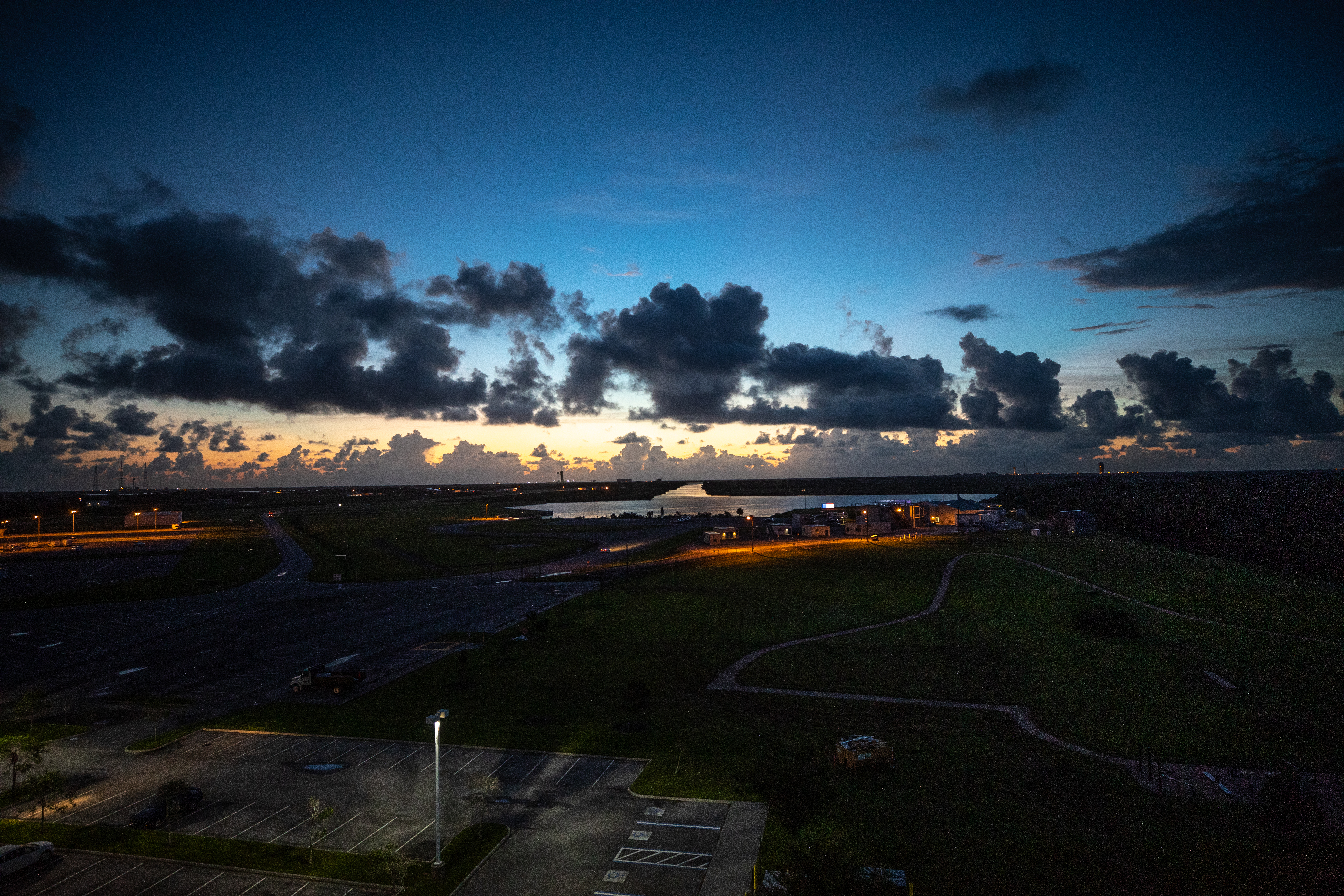 An early sunrise view of a waterway surrounding Launch Complex 39 at NASA's Kennedy Space Center in Florida on July 25, 2020. NASA’s Space Launch System and Orion spacecraft will lift off from Launch Complex 39B on Artemis I, an uncrewed mission around the Moon.