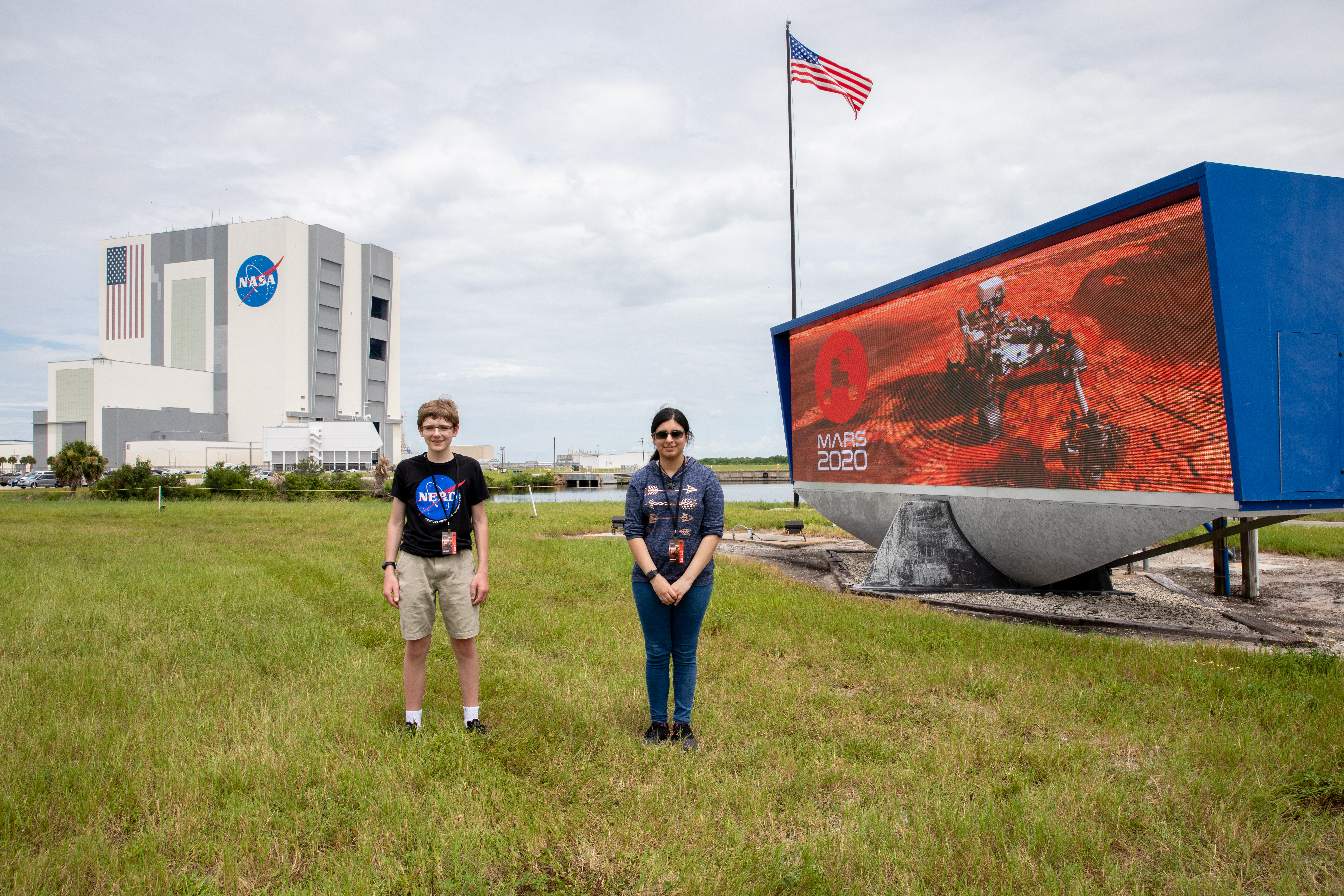 Students Alex Mather, at left, and Vaneeza Rupani, stand near the countdown clock at the News Center at NASA’s Kennedy Space Center in Florida on July 28, 2020. Mather named the Perseverance rover, and Rupani named the Ingenuity helicopter. In view in the background is the iconic Vehicle Assembly Building. The rover is scheduled to launch July 30, on a United Launch Alliance Atlas V 541 rocket from Space Launch Complex 41 at nearby Cape Canaveral Air Force Station. The rover is part of NASA’s Mars Exploration Program, a long-term effort of robotic exploration of the Red Planet. The rover will search for habitable conditions in the ancient past and signs of past microbial life on Mars. The Launch Services Program at Kennedy is responsible for launch management.