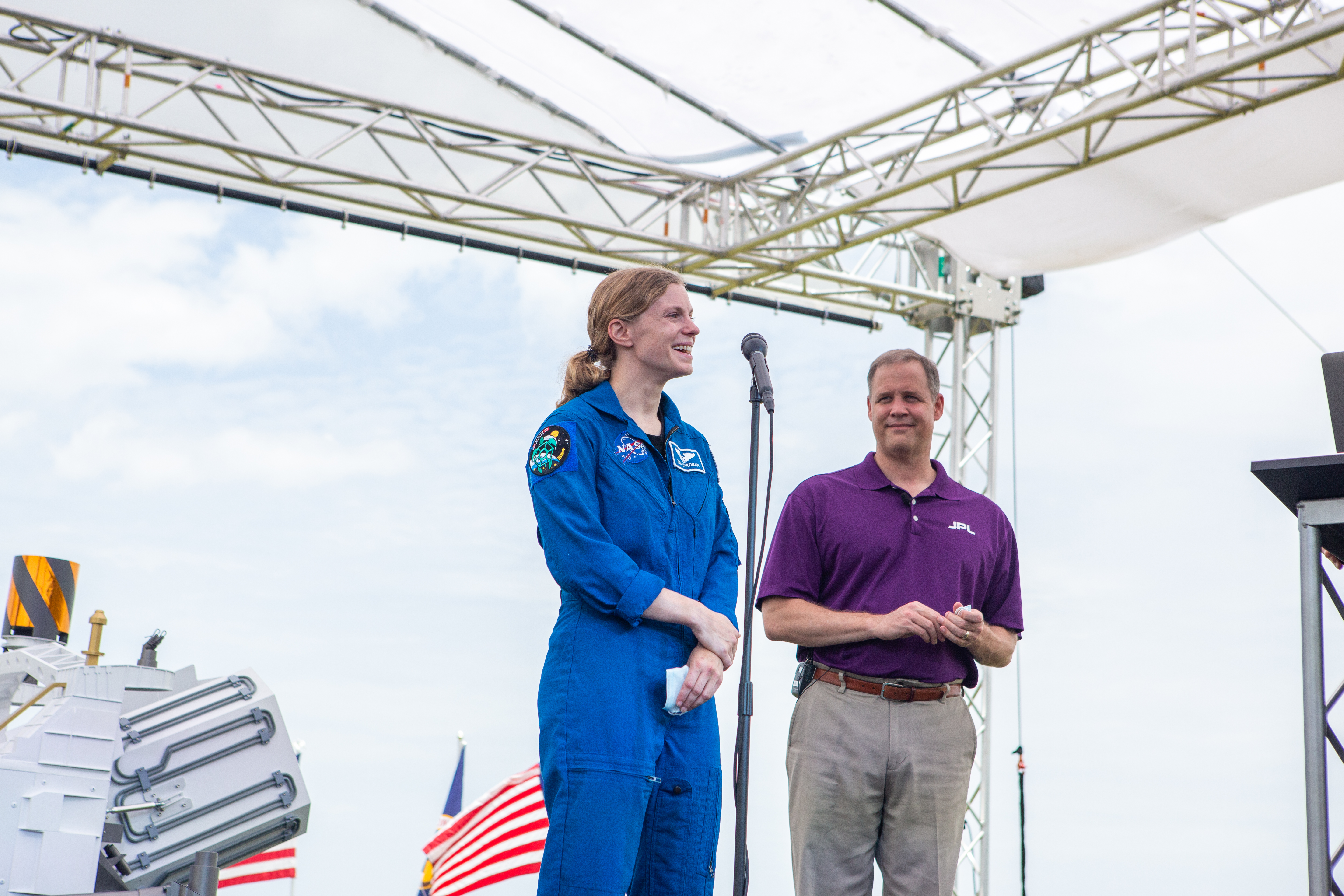 NASA astronaut Zena Cardman answers a question during a Mars 2020 NASA Social at Kennedy Space Center’s News Center in Florida on July 29, 2020. At right is NASA Administrator Jim Bridenstine. The Mars Perseverance rover and Ingenuity helicopter are scheduled to launch July 30, on a United Launch Alliance Atlas V 541 rocket from Space Launch Complex 41 at nearby Cape Canaveral Air Force Station. The rover is part of NASA’s Mars Exploration Program, a long-term effort of robotic exploration of the Red Planet. The rover will search for habitable conditions in the ancient past and signs of past microbial life on Mars. The Launch Services Program at Kennedy is responsible for launch management.