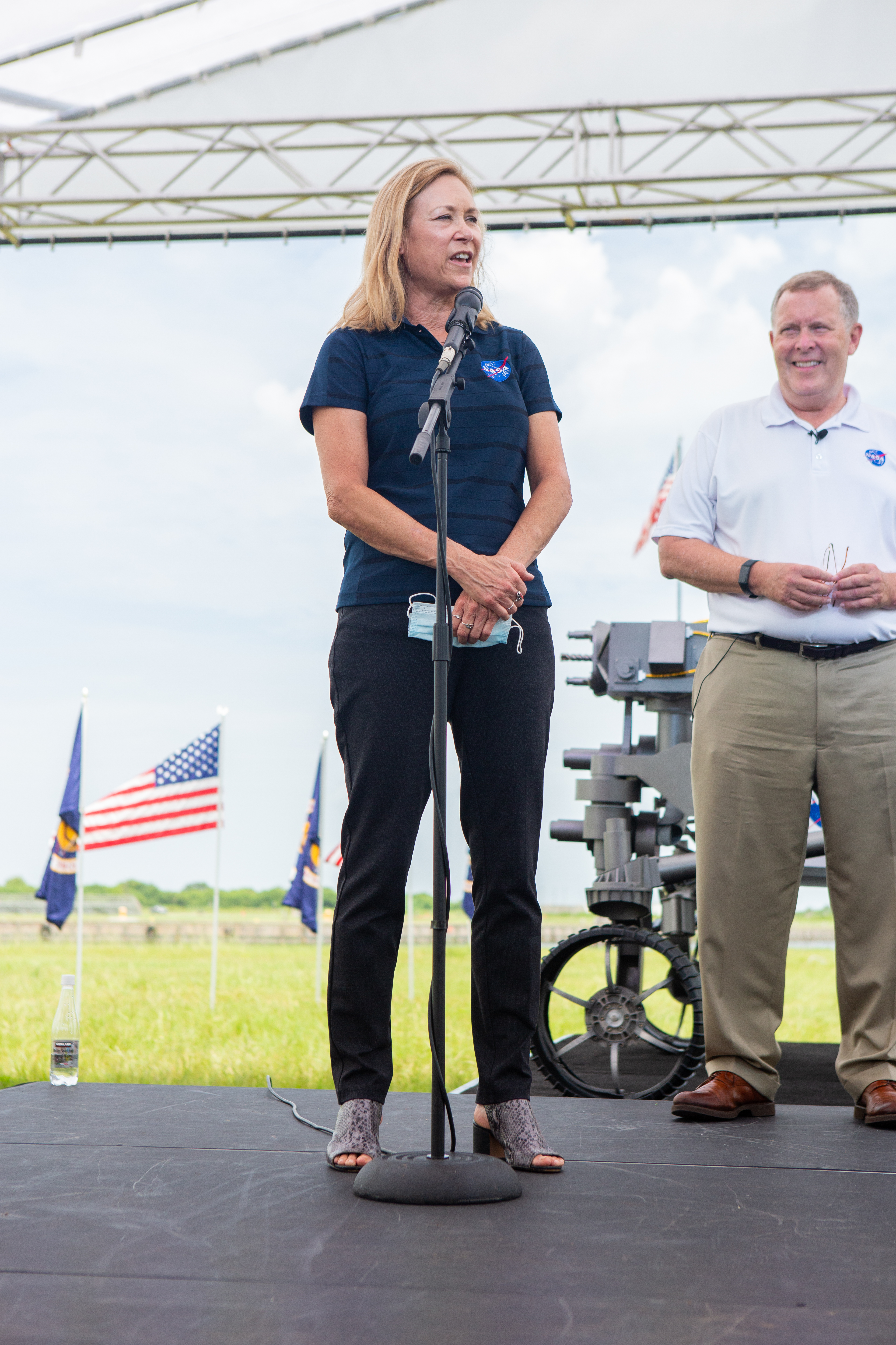 Kennedy Space Center Deputy Director Janet Petro answers questions during a Mars 2020 NASA Social at the center’s News Center in Florida on July 29, 2020. At right is NASA Deputy Administrator Jim Morhard. The Mars Perseverance rover and Ingenuity helicopter are scheduled to launch July 30, on a United Launch Alliance Atlas V 541 rocket from Space Launch Complex 41 at nearby Cape Canaveral Air Force Station. The rover is part of NASA’s Mars Exploration Program, a long-term effort of robotic exploration of the Red Planet. The rover will search for habitable conditions in the ancient past and signs of past microbial life on Mars. The Launch Services Program at Kennedy is responsible for launch management.