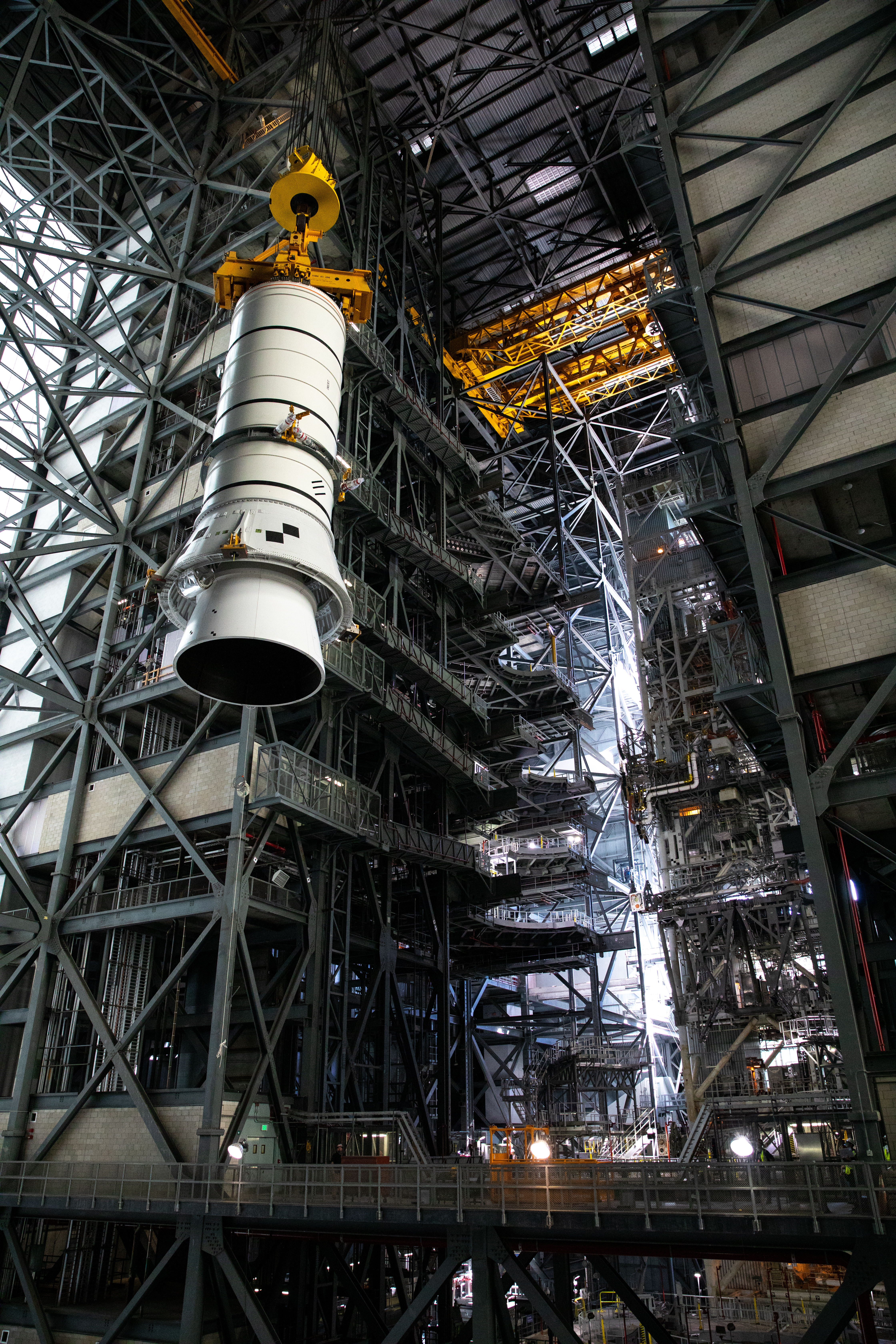 Technicians with NASA’s Exploration Ground Systems rehearse lifting operations using a mock-up of the Space Launch System (SLS) aft booster segment, referred to as a pathfinder, inside the Vehicle Assembly Building (VAB) at the agency’s Kennedy Space Center in Florida on Sept. 11, 2020, in preparation for Artemis I. The exercise involved preparing the aft pathfinder segment in High Bay 4 of the VAB and moving it over to High Bay 3, where it was placed on the mobile launcher. Stacking of the actual booster segments will occur later this year, before the SLS core stage arrives at Kennedy. Artemis I is the first in a series of increasingly complex missions that will test SLS and the Orion spacecraft as an integrated system prior to crewed flights to the Moon.