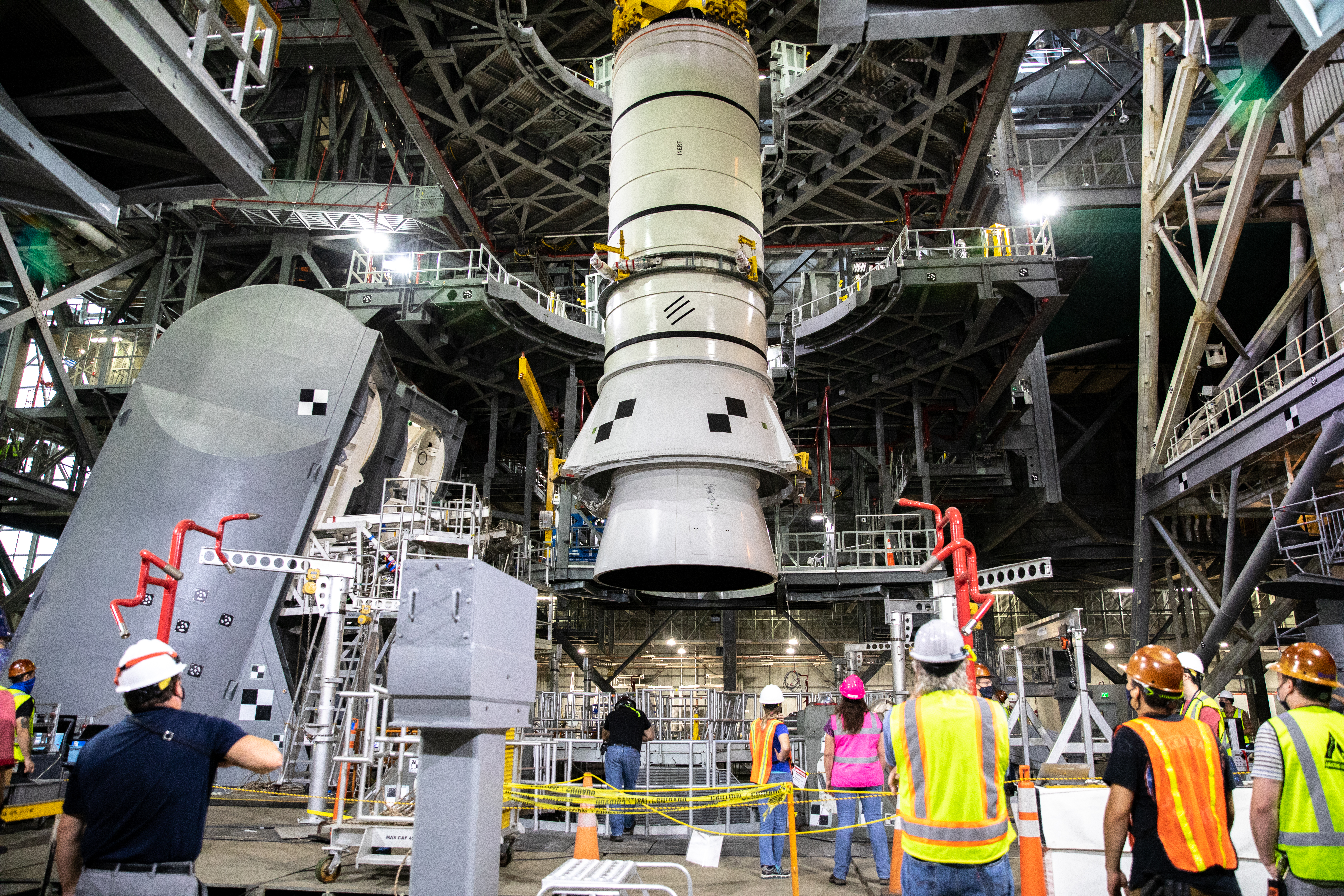 During a training exercise, technicians with NASA’s Exploration Ground Systems lower a mock-up of the Space Launch System (SLS) aft booster segment, referred to as a pathfinder, onto the mobile launcher in Kennedy Space Center’s Vehicle Assembly Building (VAB) on Sept. 11, 2020. The rehearsal involved teams preparing the aft pathfinder segment in High Bay 4 of the VAB, lifting and moving it over to High Bay 3, and placing it on the mobile launcher in preparation for Artemis I. Stacking of the actual booster segments will occur later this year, before the SLS core stage arrives at the Florida spaceport. Artemis I is the first in a series of increasingly complex missions that will test SLS and the Orion spacecraft as an integrated system prior to crewed flights to the Moon.