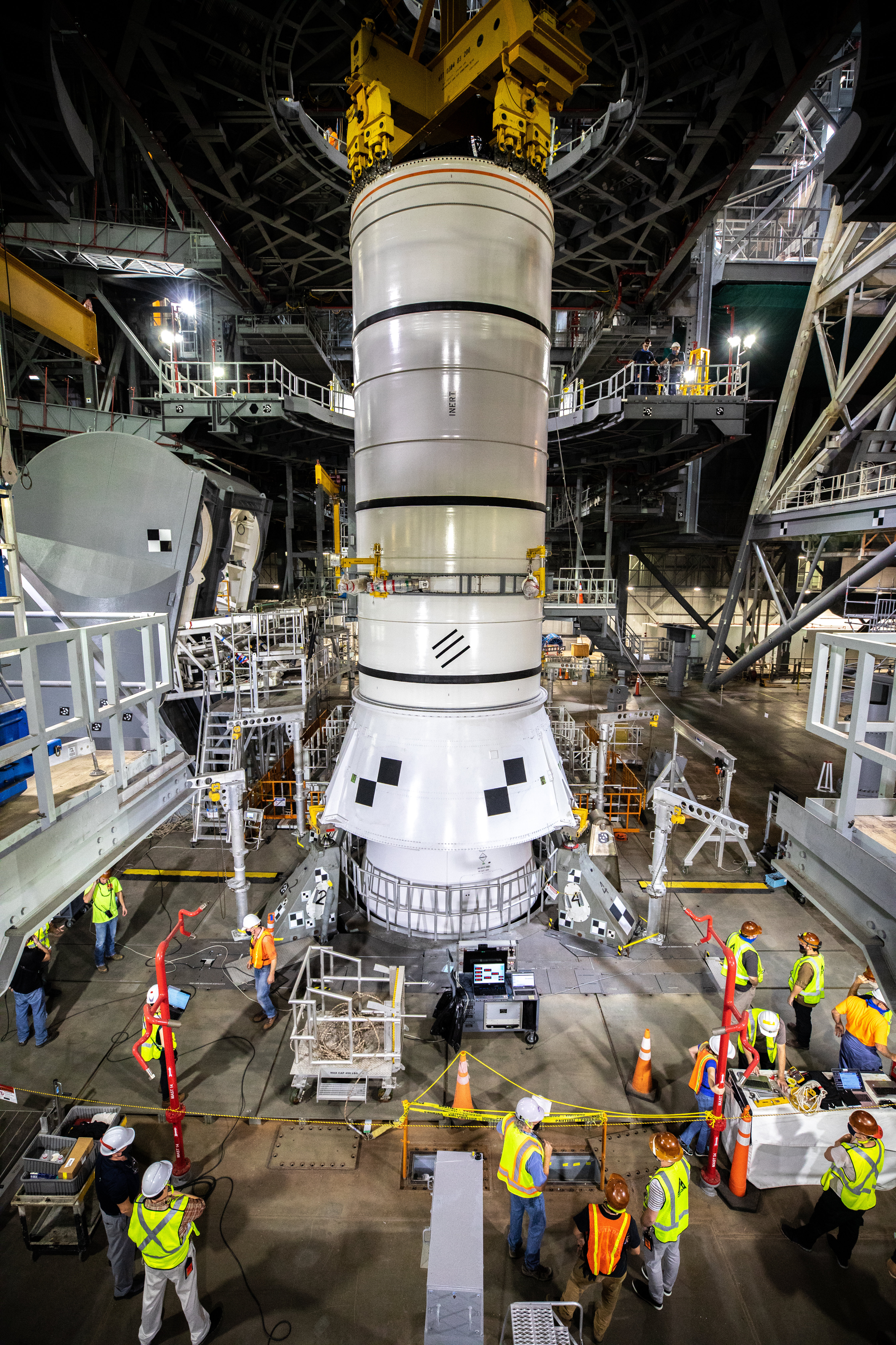 During a training exercise, technicians with NASA’s Exploration Ground Systems lower a mock-up of the Space Launch System (SLS) aft booster segment, referred to as a pathfinder, onto the mobile launcher in Kennedy Space Center’s Vehicle Assembly Building (VAB) on Sept. 11, 2020. The rehearsal involved teams preparing the aft pathfinder segment in High Bay 4 of the VAB, lifting and moving it over to High Bay 3, and placing it on the mobile launcher in preparation for Artemis I. Stacking of the actual booster segments will occur later this year, before the SLS core stage arrives at the Florida spaceport. Artemis I is the first in a series of increasingly complex missions that will test SLS and the Orion spacecraft as an integrated system prior to crewed flights to the Moon.