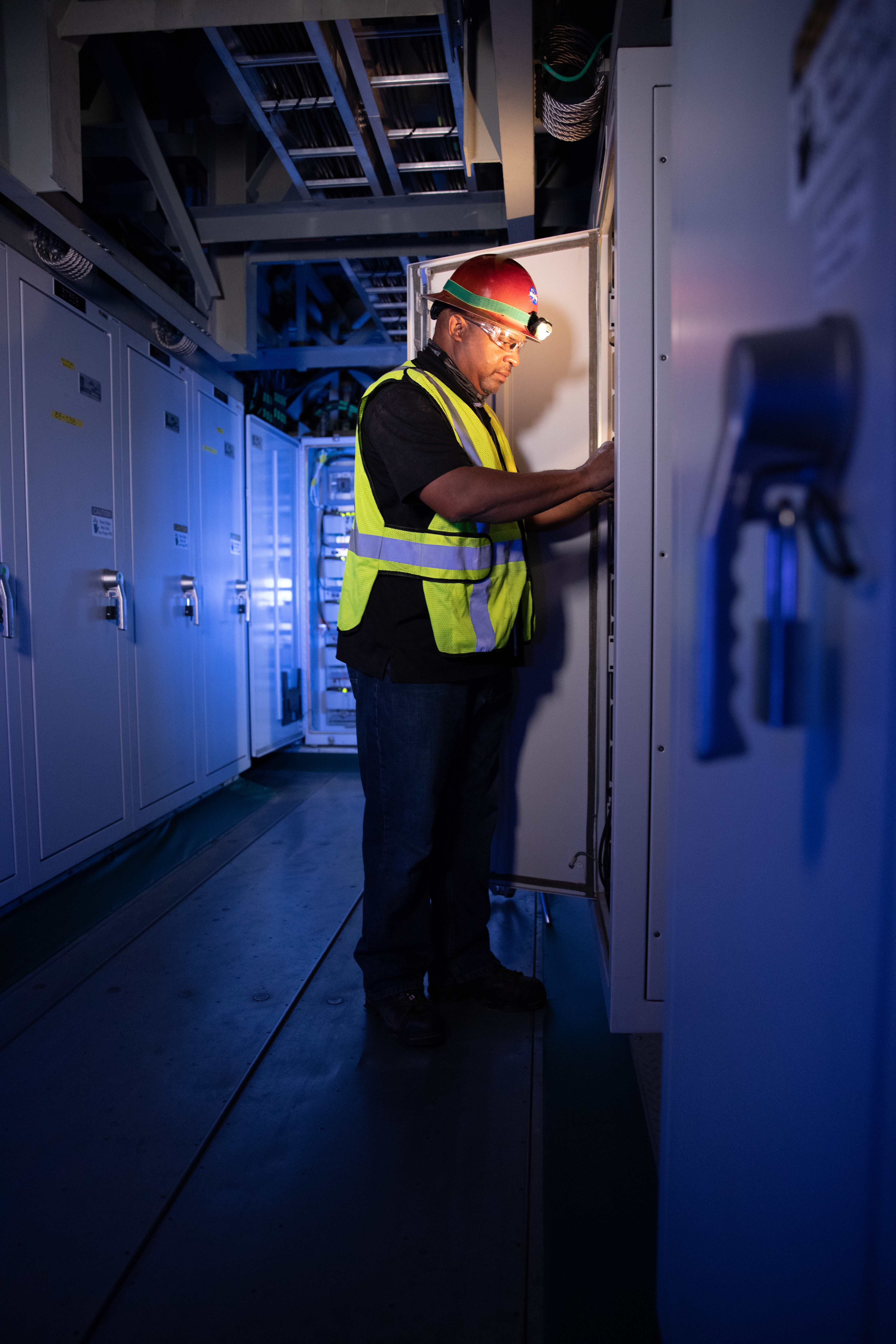 Reggie Martin, an engineer with Exploration Ground Systems, works on racks inside the mobile launcher at NASA’s Kennedy Space Center in Florida on Oct. 2, 2020. Software engineers are writing and testing new software for launch of the Space Launch System and Orion spacecraft for Artemis I.