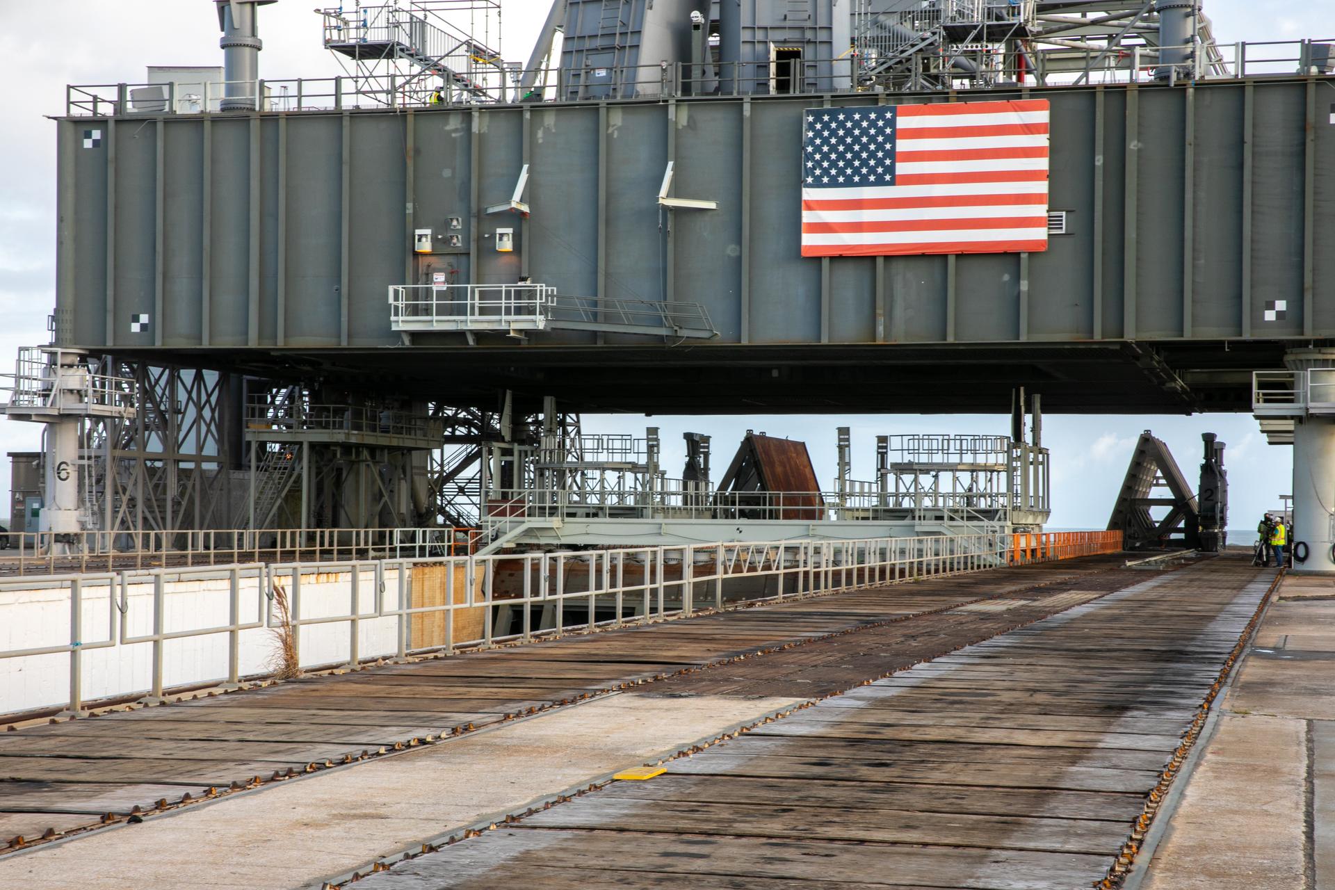 The base of the mobile launcher for Artemis I is in view on Launch Pad 3B at NASA’s Kennedy Space Center in Florida on Oct. 23, 2020. Workers on scaffolding are preparing for a launch countdown demonstration. The nearly 400-foot-tall mobile launcher will remain at the pad while engineers with Exploration Ground Systems and Jacobs complete several tasks, including a timing test to validate the launch team’s countdown timeline, and a thorough, top-to-bottom wash down of the mobile launcher to remove any debris remaining from construction and installation of the umbilical arms. Artemis I will test the Orion spacecraft and Space Launch System as an integrated system ahead of crewed flights to the Moon. Under the Artemis program, NASA will land the first woman and the next man on the Moon in 2024.