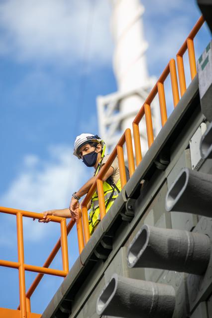 An engineer with Exploration Ground Systems monitors countdown demonstration activities occurring on the mobile launcher for Artemis I on Oct. 23, 2020, at Launch Pad 39B at NASA’s Kennedy Space Center in Florida. The nearly 400-foot-tall mobile launcher is at the pad while engineers with Exploration Ground Systems and Jacobs complete several tasks, including a timing test to validate the launch team’s countdown timeline, and a thorough, top-to-bottom wash down of the mobile launcher to remove any debris remaining from construction and installation of the umbilical arms. Artemis I will test the Orion spacecraft and Space Launch System as an integrated system ahead of crewed flights to the Moon. Under the Artemis program, NASA will land the first woman and the next man on the Moon in 2024.