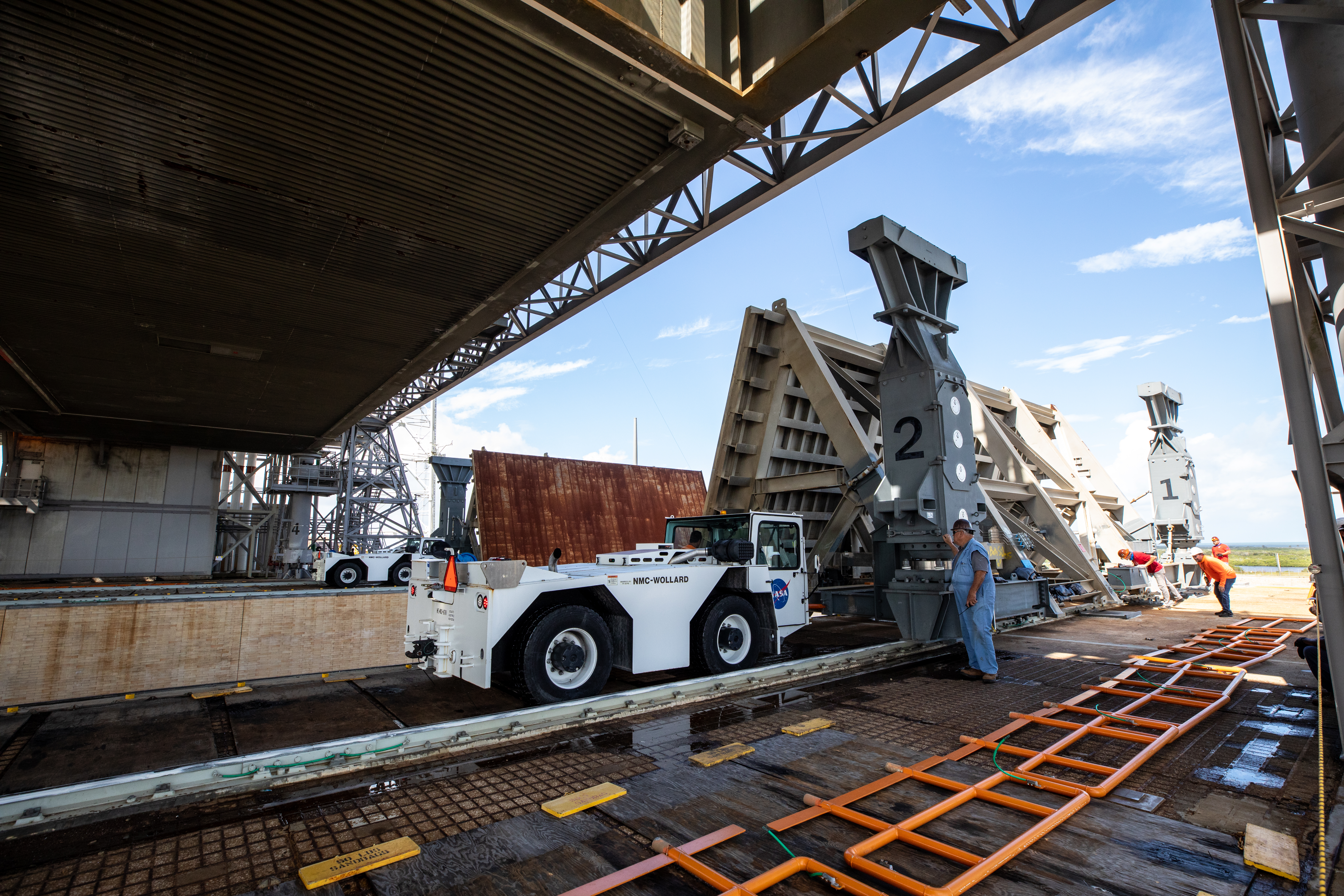 Special ground support equipment is used to move one of two side flame deflectors underneath the mobile launcher for Artemis I during a countdown demonstration test at Launch Pad 39B at NASA’s Kennedy Space Center in Florida on Oct. 23, 2020. The nearly 400-foot-tall mobile launcher is at the pad while engineers with Exploration Ground Systems and Jacobs complete several tasks, including a timing test to validate the launch team’s countdown timeline, and a thorough, top-to-bottom wash down of the mobile launcher to remove any debris remaining from construction and installation of the umbilical arms. Artemis I will test the Orion spacecraft and Space Launch System as an integrated system ahead of crewed flights to the Moon. Under the Artemis program, NASA will land the first woman and the next man on the Moon in 2024.
