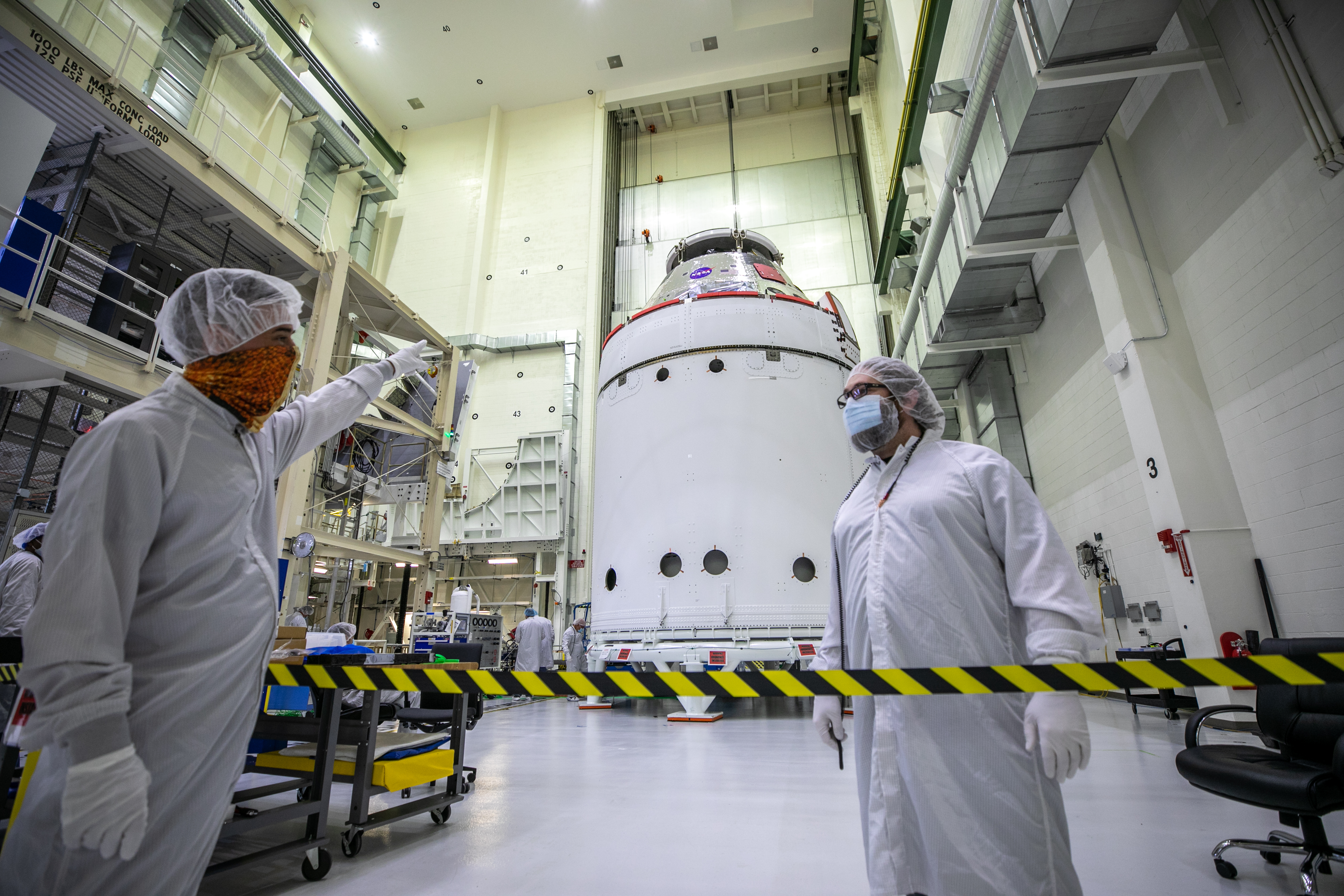 Shawn Corwin, at left, ASRC technician, Shawn Corwin, at left, points to the Orion spacecraft for the Artemis I mission inside the Neil Armstrong Operations and Checkout Building at NASA’s Kennedy Space Center in Florida on Oct. 28, 2020. At right is Eric Nolan, ASRC technician. The NASA insignia, also called the “meatball,” and American Flag have been applied to the Orion crew module back shell. Attached below Orion are the crew module adapter and the European Service Module (ESM) with spacecraft adapter jettison fairings installed. Recently, teams from across the globe installed the four solar array wings, which are housed inside the protective covering of the fairings. The fairing panels will encapsulate the ESM to protect it from harsh environments such as heat, wind, and acoustics as the spacecraft is propelled out of Earth’s atmosphere atop the Space Launch System rocket during NASA’s Artemis I mission.