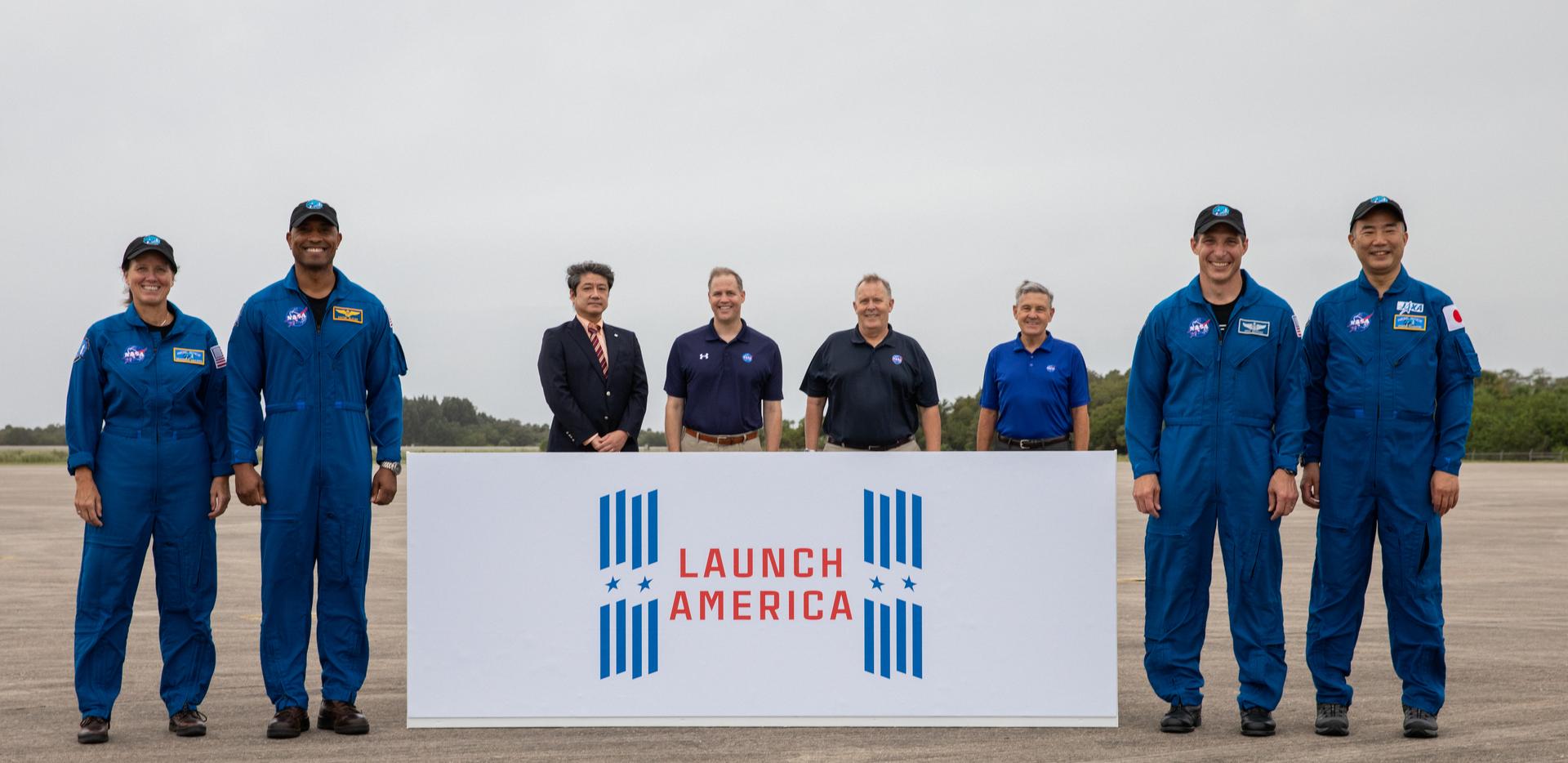 A crew arrival media event for NASA’s SpaceX Crew-1 mission is held Nov. 8, 2020, at the Launch and Landing Facility at the agency’s Kennedy Space Center in Florida. From left NASA astronaut Shannon Walker, mission specialist; NASA astronaut Victor Glover, pilot; Junichi Sakai, manager, International Space Station Program, JAXA; NASA Administrator Jim Bridenstine; NASA Deputy Administrator Jim Morhard; Bob Cabana, director, Kennedy Space Center; NASA astronaut Michael Hopkins, spacecraft commander; and JAXA astronaut Soichi Noguchi, mission specialist, pose for a photograph after speaking to members of the media. Crew-1 is the first crew rotation mission of a U.S. commercial spacecraft with astronauts to the International Space Station as part of NASA’s Commercial Crew Program. The SpaceX Crew Dragon spacecraft, named Resilience, will launch atop a Falcon 9 rocket from Kennedy’s Launch Complex 39A.