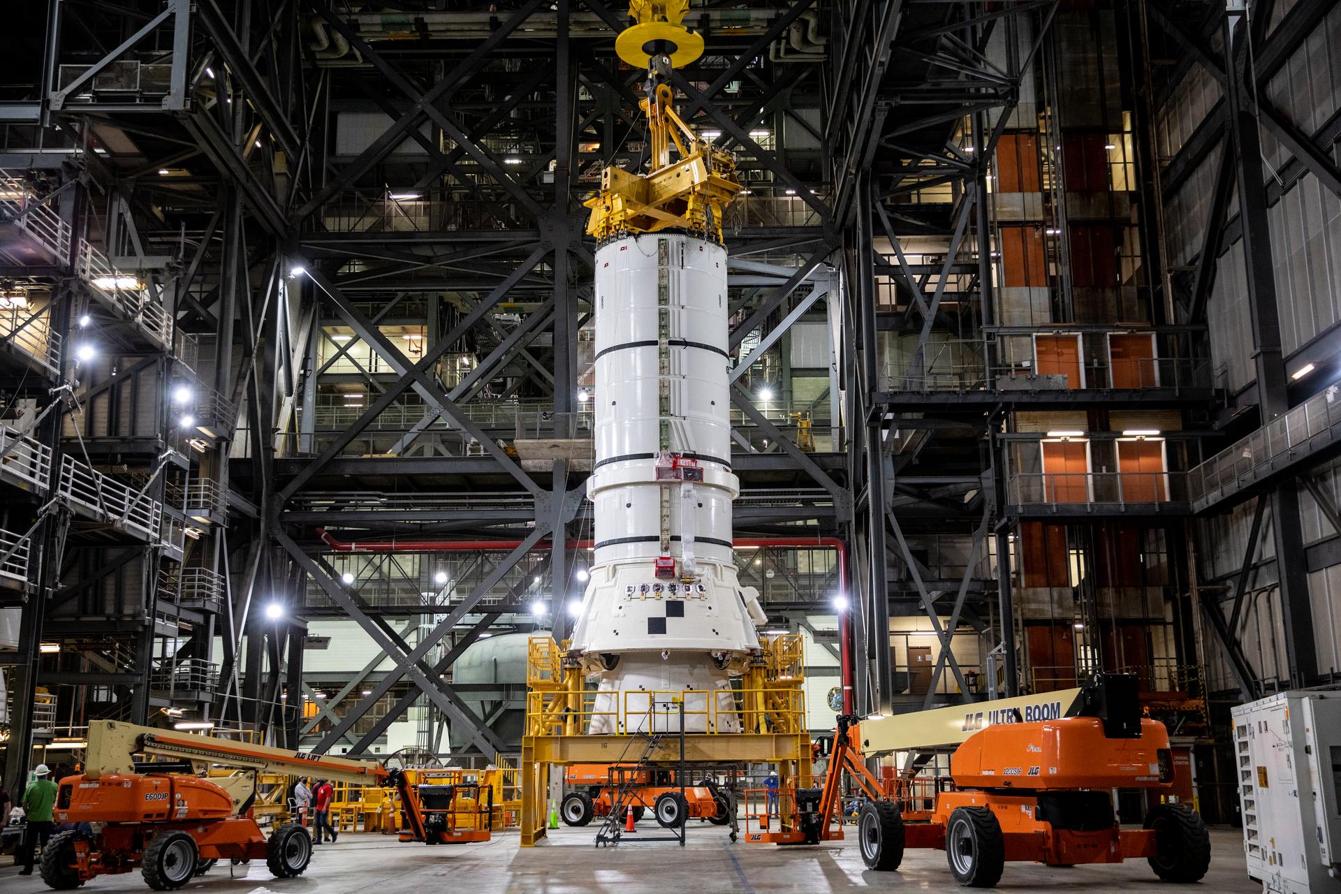 In High Bay 4 of the Vehicle Assembly Building (VAB) at NASA’s Kennedy Space Center in Florida, one of the Artemis I aft booster segments for the Space Launch System is being prepared for stacking operations on Nov. 20, 2020. Workers with Exploration Ground Systems and contractor Jacobs teams will stack the twin five-segment boosters on the mobile launcher in High Bay 3 over a number of weeks. When the core stage arrives, it will join the boosters on the mobile launcher, followed by the interim cryogenic propulsion stage and Orion spacecraft. Manufactured by Northrop Grumman in Utah, the twin boosters provide more than 75 percent of the total SLS thrust at launch. The SLS is managed by Marshall Space Flight Center in Huntsville, Alabama. Under the Artemis program, NASA will land the first woman and the next man on the Moon by 2024. The first in a series of increasingly complex missions, Artemis I will test the Orion spacecraft and SLS as an integrated system ahead of crewed flights to the Moon.