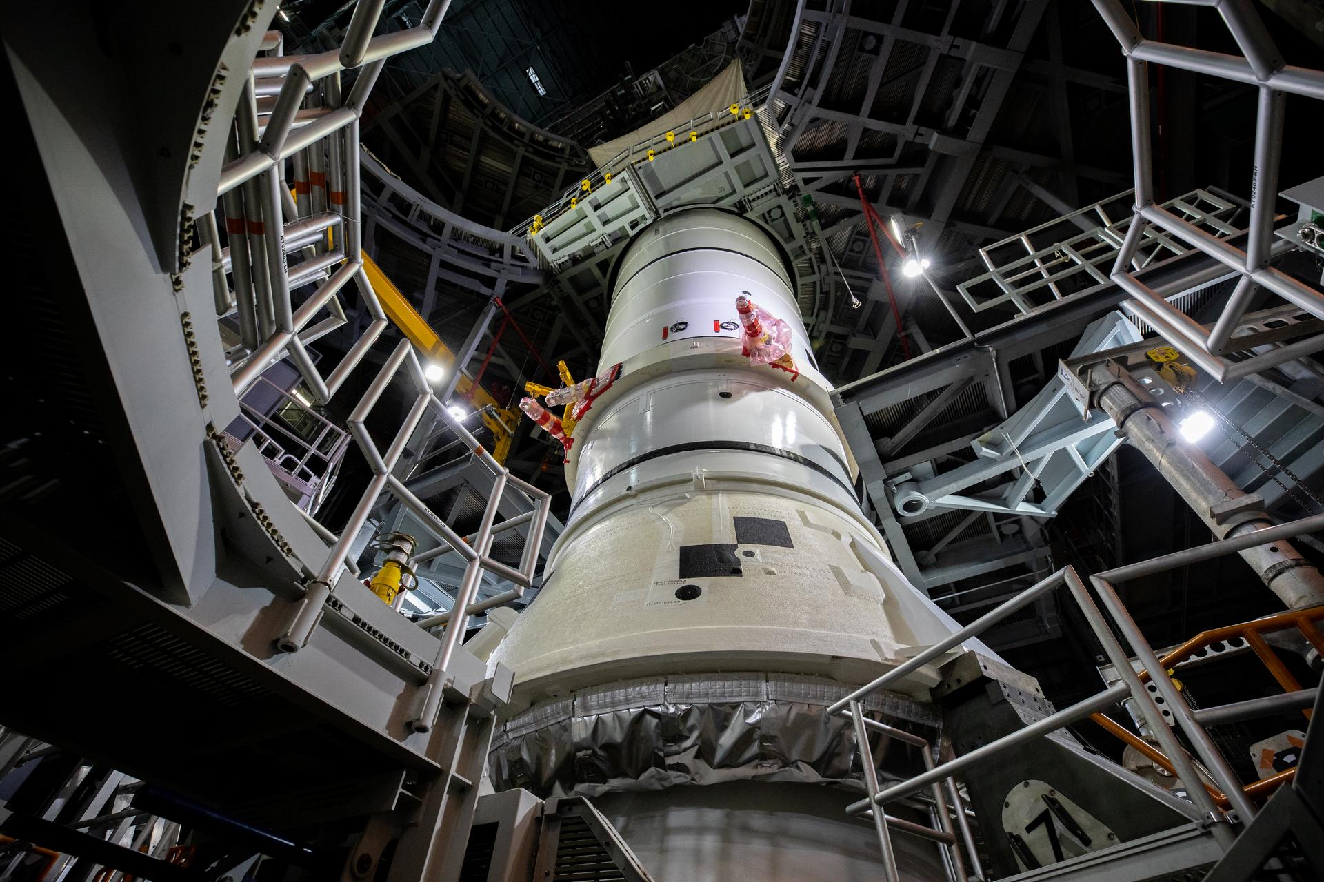 The first of two Artemis I aft booster segments for the Space Launch System is lowered onto the mobile launcher in High Bay 3 of the Vehicle Assembly Building (VAB) at NASA’s Kennedy Space Center in Florida on Nov. 23, 2020. Workers with Exploration Ground Systems and contractor Jacobs teams will stack the twin five-segment boosters on the mobile launcher in High Bay 3 over a number of weeks. When the core stage arrives, it will join the boosters on the mobile launcher, followed by the interim cryogenic propulsion stage and Orion spacecraft. Manufactured by Northrop Grumman in Utah, the twin boosters provide more than 75 percent of the total SLS thrust at launch. The SLS is managed by Marshall Space Flight Center in Huntsville, Alabama. Under the Artemis program, NASA will land the first woman and the next man on the Moon by 2024. The first in a series of increasingly complex missions, Artemis I will test the Orion spacecraft and SLS as an integrated system ahead of crewed flights to the Moon.