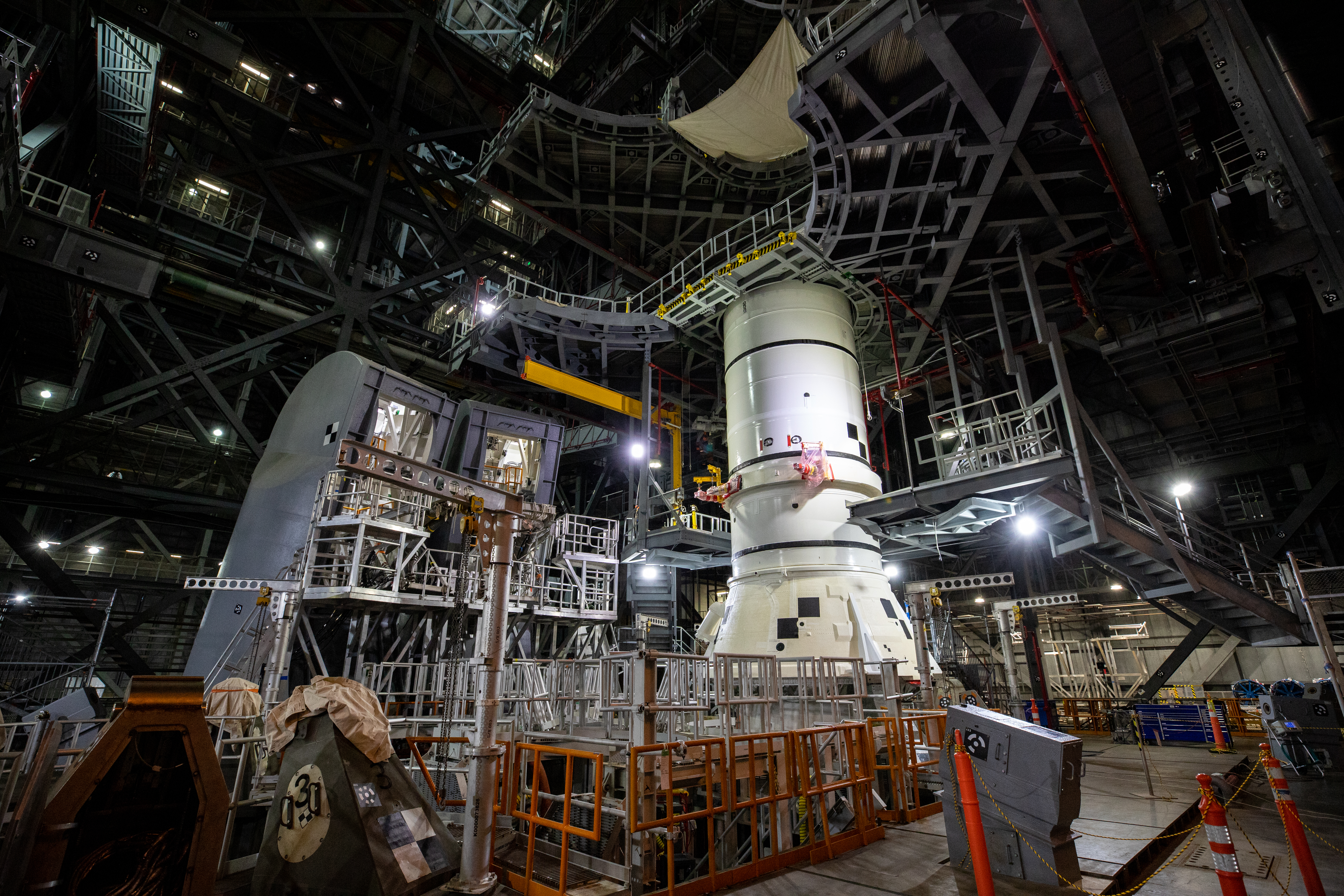 The first of two Artemis I aft booster segments for the Space Launch System is lowered onto the mobile launcher in High Bay 3 of the Vehicle Assembly Building (VAB) at NASA’s Kennedy Space Center in Florida on Nov. 23, 2020. Workers with Exploration Ground Systems and contractor Jacobs teams will stack the twin five-segment boosters on the mobile launcher in High Bay 3 over a number of weeks. When the core stage arrives, it will join the boosters on the mobile launcher, followed by the interim cryogenic propulsion stage and Orion spacecraft. Manufactured by Northrop Grumman in Utah, the twin boosters provide more than 75 percent of the total SLS thrust at launch. The SLS is managed by Marshall Space Flight Center in Huntsville, Alabama. Under the Artemis program, NASA will land the first woman and the next man on the Moon by 2024. The first in a series of increasingly complex missions, Artemis I will test the Orion spacecraft and SLS as an integrated system ahead of crewed flights to the Moon.