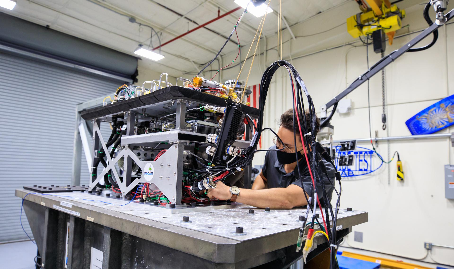 Ray Pitts, co-principal investigator for NASA’s Orbital Syngas Commodity Augmentation Reactor (OSCAR), prepares OSCAR for vibration tests inside the Vibration Test Lab at the agency’s Kennedy Space Center in Florida on Jan. 14, 2021. The tests are part of ongoing preparation for a scheduled suborbital flight test later this year. Beginning as an Early Career Initiative project, OSCAR studies technology to convert trash and human waste into useful gasses such as methane, hydrogen, and carbon dioxide. By processing small pieces of trash in a high-temperature reactor, OSCAR would reduce the amount of space needed for waste storage within a spacecraft, turn some waste into gasses that have energy storage and life support applications, and ensure waste is no longer biologically active.