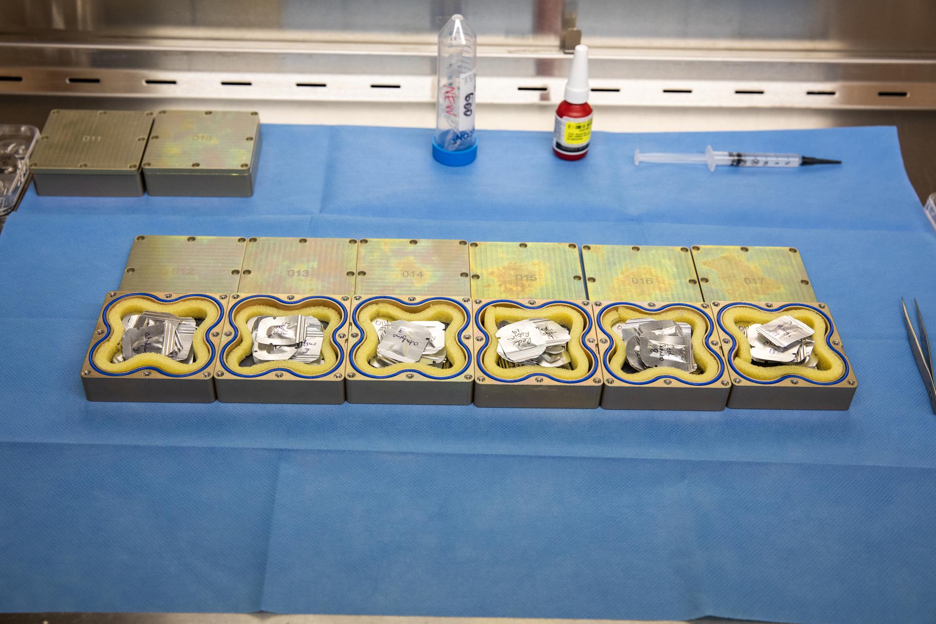 Containers carrying set of seeds for a Materials International Space Station Experiment (MISSE) are shown Feb. 11, 2021, at NASA’s Kennedy Space Center in Florida. The containers will fly aboard Northrop Grumman’s Cygnus spacecraft as part of NG-15, a NASA commercial resupply mission to the orbiting laboratory targeted for Feb. 20, 2021. They will be placed in the MISSE testing facility, located near the space station’s solar arrays, where they will be exposed to the extreme environment of space for six months before returning to Earth for further study.