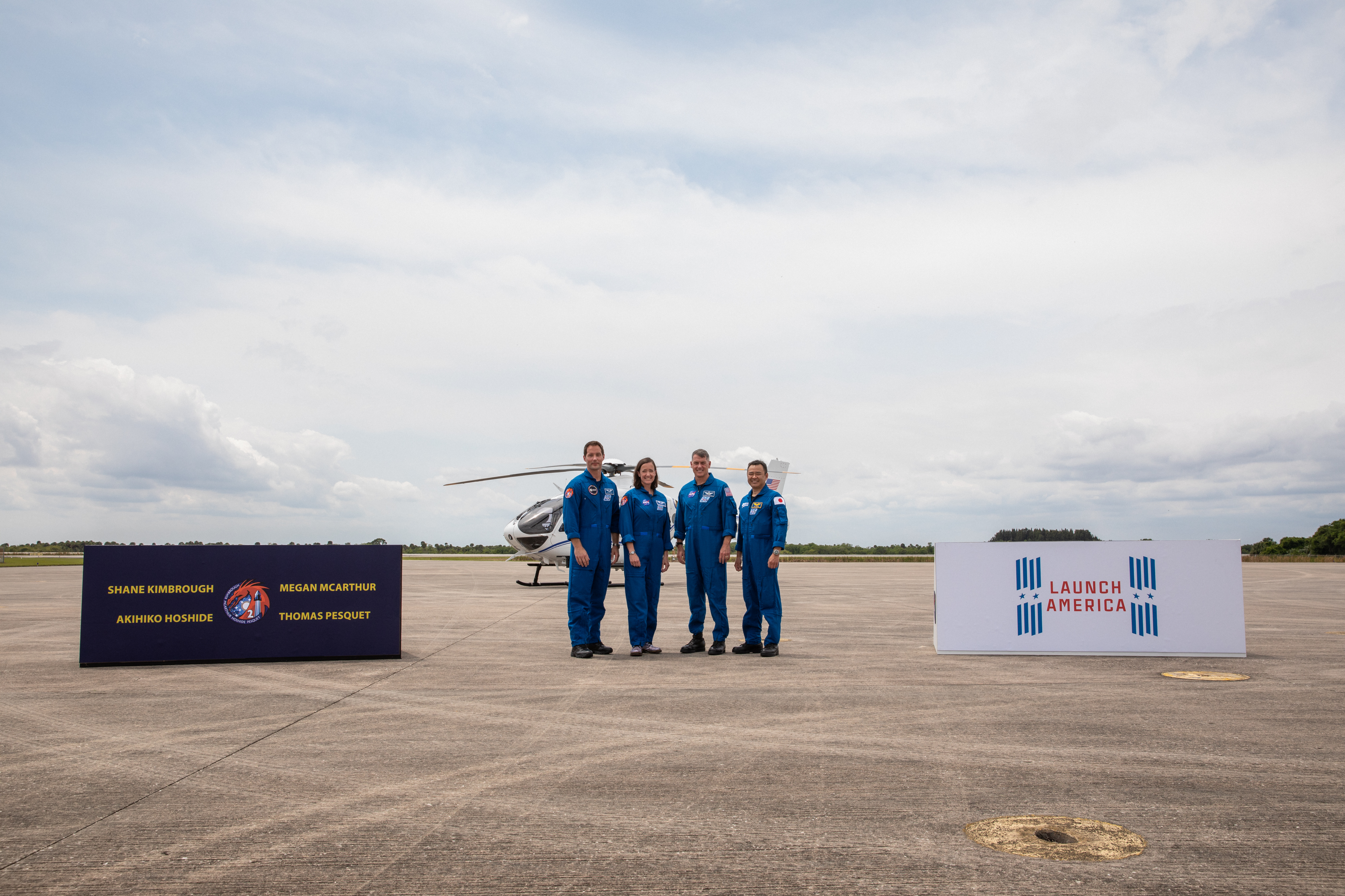 From left to right, Crew-2 mission astronauts Thomas Pesquet (ESA), Megan McArthur (NASA), Shane Kimbrough (NASA), and Akihiko Hoshide (JAXA), arrive at Kennedy Space Center’s Launch and Landing Facility on April 16, 2021. The astronauts departed by plane from Ellington Field near the agency’s Johnson Space Center in Houston, making the short flight and touching down at Kennedy. The Crew-2 mission is set to lift off from Kennedy’s Launch Complex 39A on April 22, at 6:11 a.m. EDT.