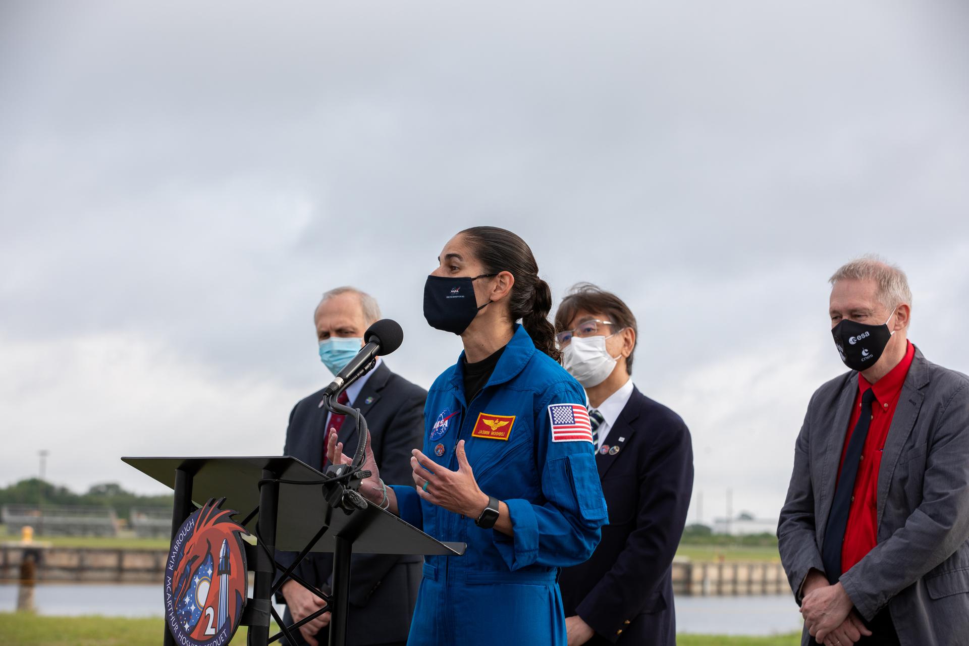 NASA astronaut Jasmin Moghbeli addresses members of the news media during a press briefing April 21, 2021, near the Press Site countdown clock at NASA’s Kennedy Space Center in Florida ahead of the agency’s SpaceX Crew-2 launch. NASA astronauts Shane Kimbrough and Megan McArthur, JAXA astronaut Akihiko Hoshide, and ESA astronaut Thomas Pesquet will fly on Crew-2, the second crew rotation mission to the International Space Station as part of NASA’s Commercial Crew Program. They will launch aboard SpaceX’s Crew Dragon spacecraft, named Endeavour, powered by the company’s Falcon 9 rocket. Liftoff is set for Friday, April 23, at 5:49 a.m. EDT.