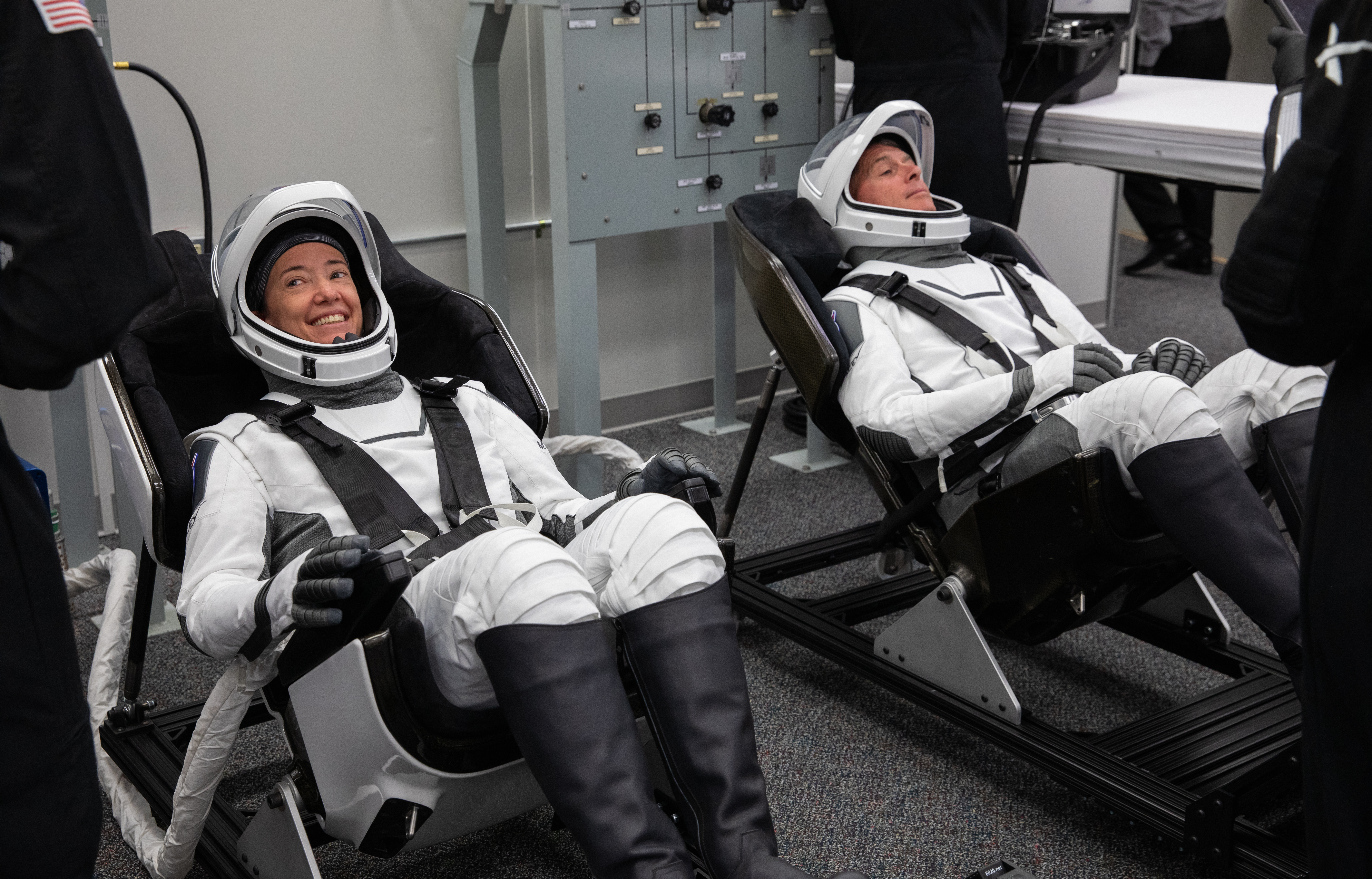 NASA astronauts Megan McArthur, left, and Shane Kimbrough are seated inside the crew suit-up room in the Neil Armstrong Operations and Checkout Building at NASA’s Kennedy Space Center in Florida, on April 23, 2021. McArthur and Kimbrough, along with ESA astronaut Thomas Pesquet and JAXA astronaut Akihiko Hoshide, will head to the International Space Station on NASA’s SpaceX Crew-2 mission. SpaceX’s Crew Dragon Endeavour will launch on the company’s Falcon 9 rocket from Kennedy’s Launch Complex 39A today at 5:49 a.m. EDT.