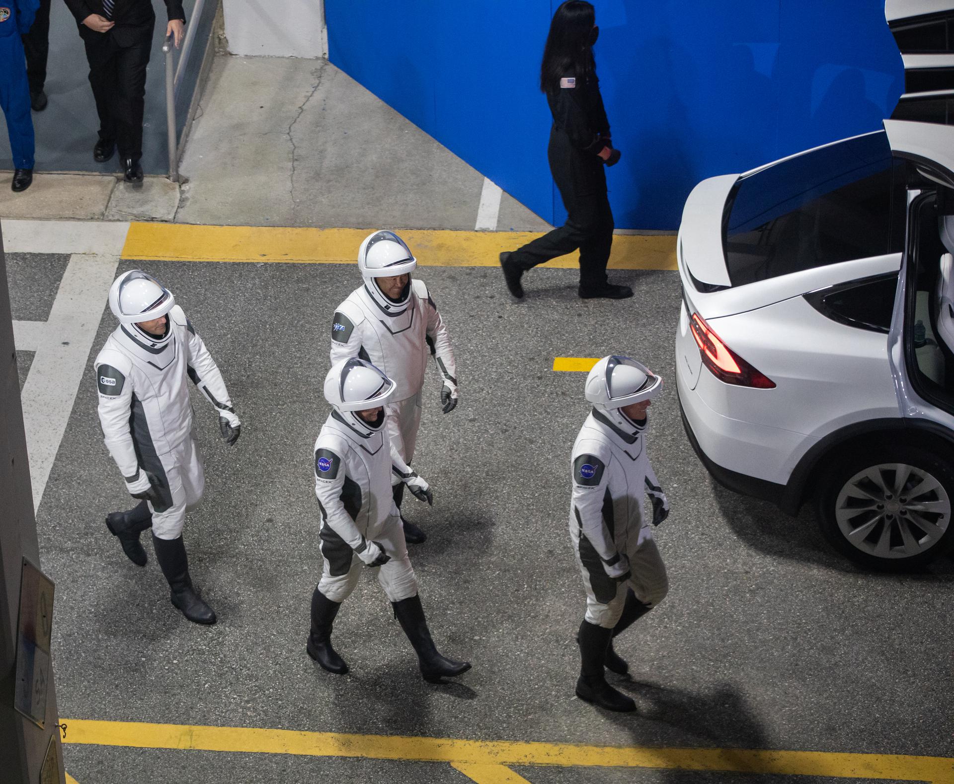 NASA SpaceX’s Crew-2 astronauts walk outside of the Neil Armstrong Operations and Checkout Building at NASA’s Kennedy Space Center in Florida on April 23, 2021. NASA astronaut Shane Kimbrough, spacecraft commander; NASA astronaut Megan McArthur, pilot; ESA astronaut Thomas Pesquet, mission specialist; and JAXA astronaut Akihiko Hoshide, mission specialist then boarded two Tesla vehicles for the trip to Kennedy’s Launch Complex 39A. Crew-2 is the second regular crew mission of a U.S. commercial spacecraft with astronauts to the International Space Station as part of NASA’s Commercial Crew Program. The SpaceX Crew Dragon Endeavour will launch atop the company’s Falcon 9 rocket from Pad 39A to the space station for a six-month science mission.