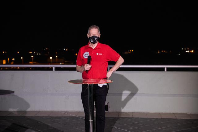 Frank de Winne, manager, International Space Station Program, European Space Agency (ESA), participates in an interview on the Operations and Support Building II balcony during the launch broadcast for NASA’s SpaceX Crew-2 mission at the agency’s Kennedy Space Center in Florida on April 23, 2021. The SpaceX Falcon 9 rocket and Crew Dragon spacecraft lifted off from Kennedy’s Launch Complex 39A at 5:49 a.m. EDT. Part of NASA’s Commercial Crew Program, Crew-2 delivered NASA astronauts Shane Kimbrough and Megan McArthur, Japan Aerospace Exploration Agency (JAXA) astronaut Akihiko Hoshide, and ESA astronaut Thomas Pesquet to the International Space Station for a six-month science mission.