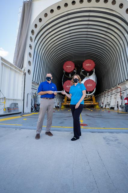 Space Launch System (SLS) Stages Manager Julie Bassler, right, celebrates the arrival of the SLS core stage by symbolically “passing the baton” to Exploration Ground Systems’ (EGS) Senior Vehicle Operations Manager Cliff Lanham on April 28, 2021, at NASA’s Kennedy Space Center in Florida. Journeying from the agency’s Stennis Space Center in Mississippi aboard the Pegasus barge, the core stage arrived at the Florida spaceport on April 27 to be processed for flight by EGS. It is the final piece of Artemis hardware to arrive at Kennedy and will be offloaded and moved to the Vehicle Assembly Building, where it will be prepared for integration atop the mobile launcher with the completed stack of solid rocket boosters ahead of the Artemis I launch. The first in a series of increasingly complex missions, Artemis I will test SLS and Orion as an integrated system prior to crewed flights to the Moon.