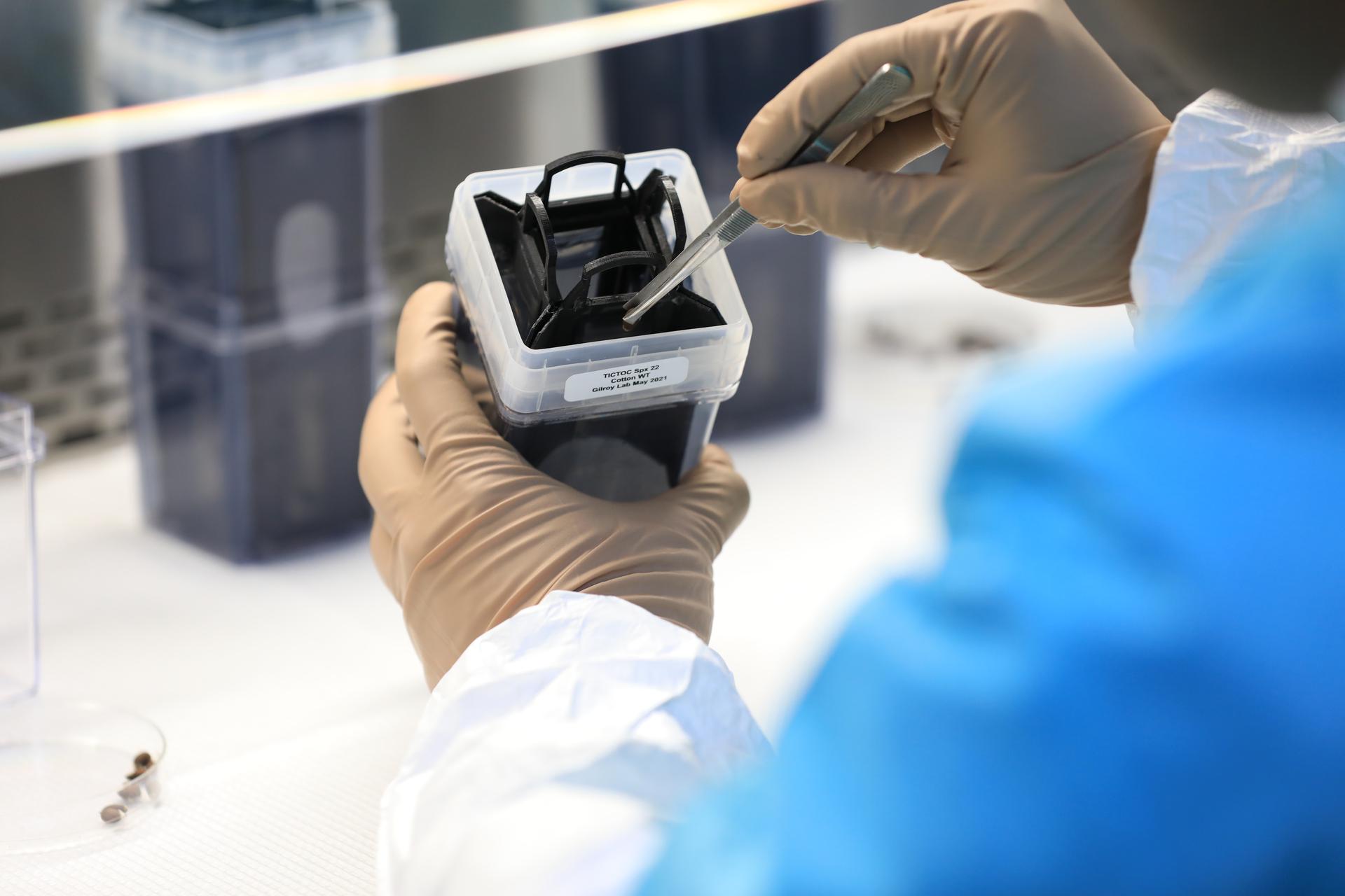 Dr. Arko Bakshi, a research associate with the Department of Botany at the University of Wisconsin, Madison, adds nutrient gel to Target Veggie Chambers, or TVCs, inside a laboratory in the Space Station Processing Facility at Kennedy Space Center in Florida on May 28, 2021. Bakshi waited until the gel solidified and then planted cotton seeds in it as part of the Targeting Improved Cotton Through Orbital Cultivation (TICTOC) experiment, which will launch to the International Space Station aboard SpaceX’s 22nd commercial resupply services mission. TICTOC will investigate how environmental factors and genes control development of roots in the absence of gravity. Liftoff of the SpaceX Falcon 9 rocket and Dragon capsule is scheduled for 1:29 p.m. EDT Thursday, June 3, 2021, from Launch Complex 39A at Kennedy Space Center.