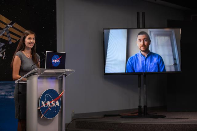 Antonia Jaramillo, NASA Communications, moderates a What’s On Board Science Briefing on June 2, 2021, at Kennedy Space Center in Florida for SpaceX’s 22nd Commercial Resupply Services mission for NASA to the International Space Station. On screen, principal investigator Dr. Thomas Boothby describes the Cell Science-04 experiment that will be delivered to the space station. Cell Science-04 will research the effects of microgravity on tardigrades, more commonly known as water bears. The results could advance understanding of the stress factors affecting humans in space. The SpaceX Falcon 9 rocket with the Dragon capsule atop is scheduled to launch at 1:29 p.m. EDT on Thursday, June 3, from the center’s Launch Complex 39A. Dragon will deliver more than 7,300 pounds of cargo and science experiments to the space station.