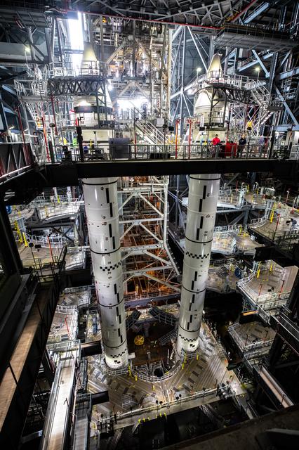 The fully stacked twin solid rocket boosters for NASA’s Space Launch System (SLS) rocket are seen on top of the mobile launcher inside High Bay 3 of the Vehicle Assembly Building (VAB) at the agency’s Kennedy Space Center in Florida on June 4, 2021. Now that booster stacking is complete, teams with NASA’s Exploration Ground Systems and contractor Jacobs are preparing to integrate the massive core stage, which arrived at Kennedy in April 2020, with the boosters inside the VAB. The 188,000-pound core stage alone will provide more than 2 million pounds of thrust at launch, and coupled with the boosters, will provide more than 8.8 million pounds of thrust to launch the Artemis I mission. The first in an increasingly complex series of missions, Artemis I will test SLS and the Orion spacecraft as an integrated system ahead of crewed flights to the Moon.