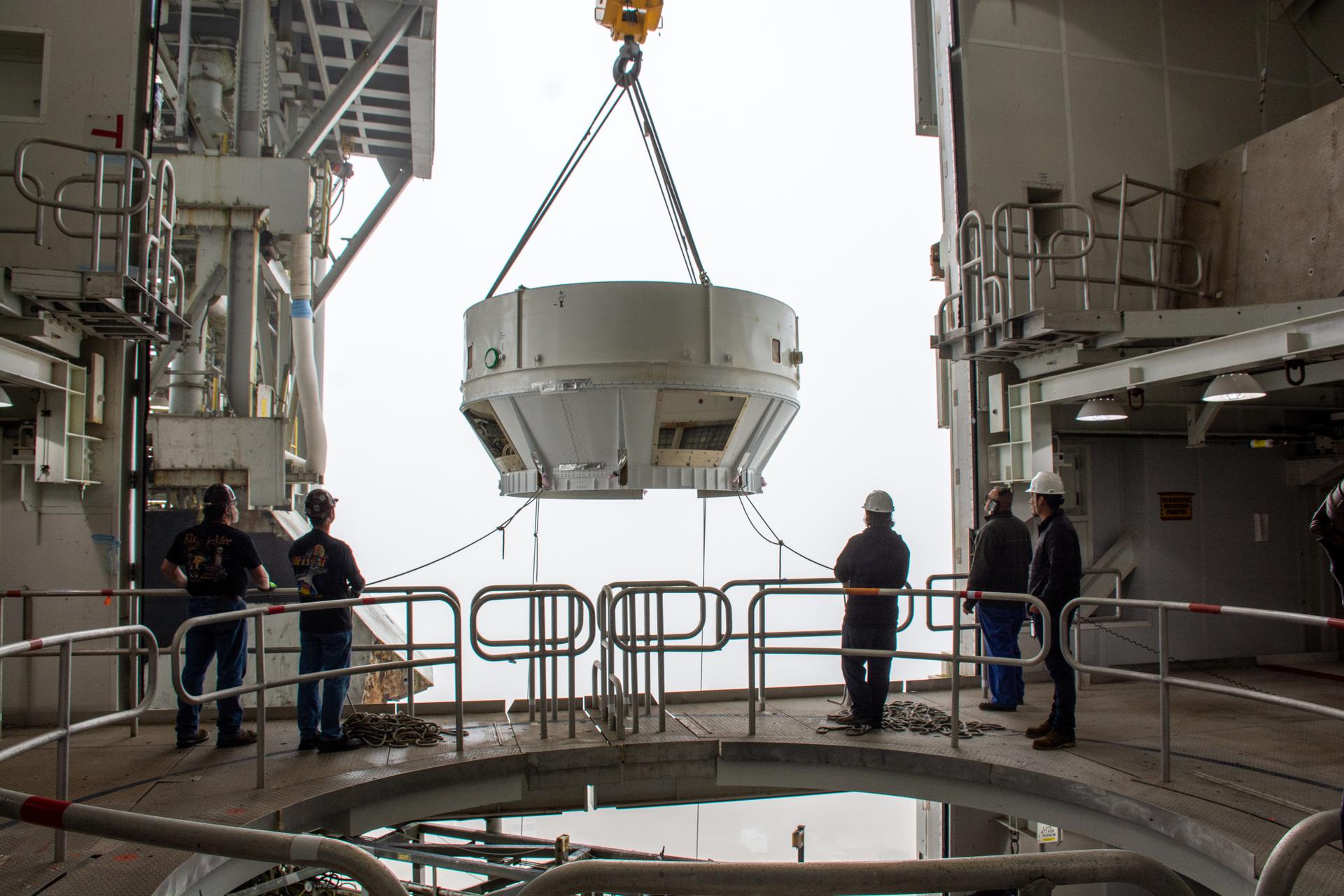 The Atlas V boat tail for the Landsat 9 mission is lifted and mated at Vandenberg Space Force Base’s Space Launch Complex 3 in California on July 17, 2021. The Landsat 9 mission launch, which is being managed by NASA’s Launch Services Program based at Kennedy Space Center in Florida, is targeted for no earlier than Sept. 27, 2021. Landsat 9 will monitor key natural and economic resources from orbit. The satellite will carry two instruments: the Operational Land Imager 2, which collects images of Earth’s landscapes in visible, near infrared and shortwave infrared light, and the Thermal Infrared Sensor 2, which measures the temperature of land surfaces. Landsat 9 is a joint mission between NASA and the U.S. Geological Survey.