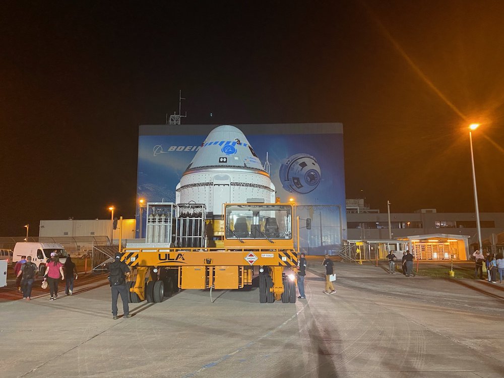 Boeing’s CST-100 Starliner spacecraft rolls out from the company’s Commercial Crew and Cargo Processing Facility at NASA’s Kennedy Space Center in Florida on July 17, 2021. The spacecraft will make the trip to Space Launch Complex-41 at Cape Canaveral Space Force Station where it will be secured atop a United Launch Alliance Atlas V rocket for Boeing’s second Orbital Flight Test (OFT-2) for NASA’s Commercial Crew Program.