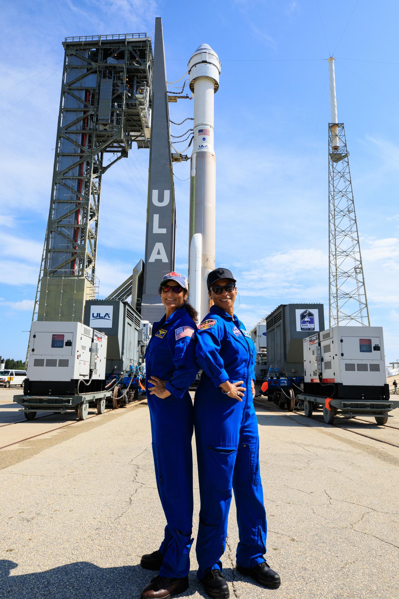 Suni Williams, left, and Jeanette Epps, NASA astronauts, Starliner-1, watch as Boeing’s CST-100 Starliner spacecraft and the United Launch Alliance Atlas V rocket is rolled out of the Vertical Integration Facility to the launch pad at Space Launch Complex-41 on July 29, 2021, at Cape Canaveral Space Force Station in Florida. Starliner will launch on the Atlas V for Boeing’s second uncrewed Orbital Flight Test (OFT-2) for NASA’s Commercial Crew Program. OFT-2 is an important uncrewed mission designed to test the end-to-end capabilities of the new system for NASA’s Commercial Crew Program.