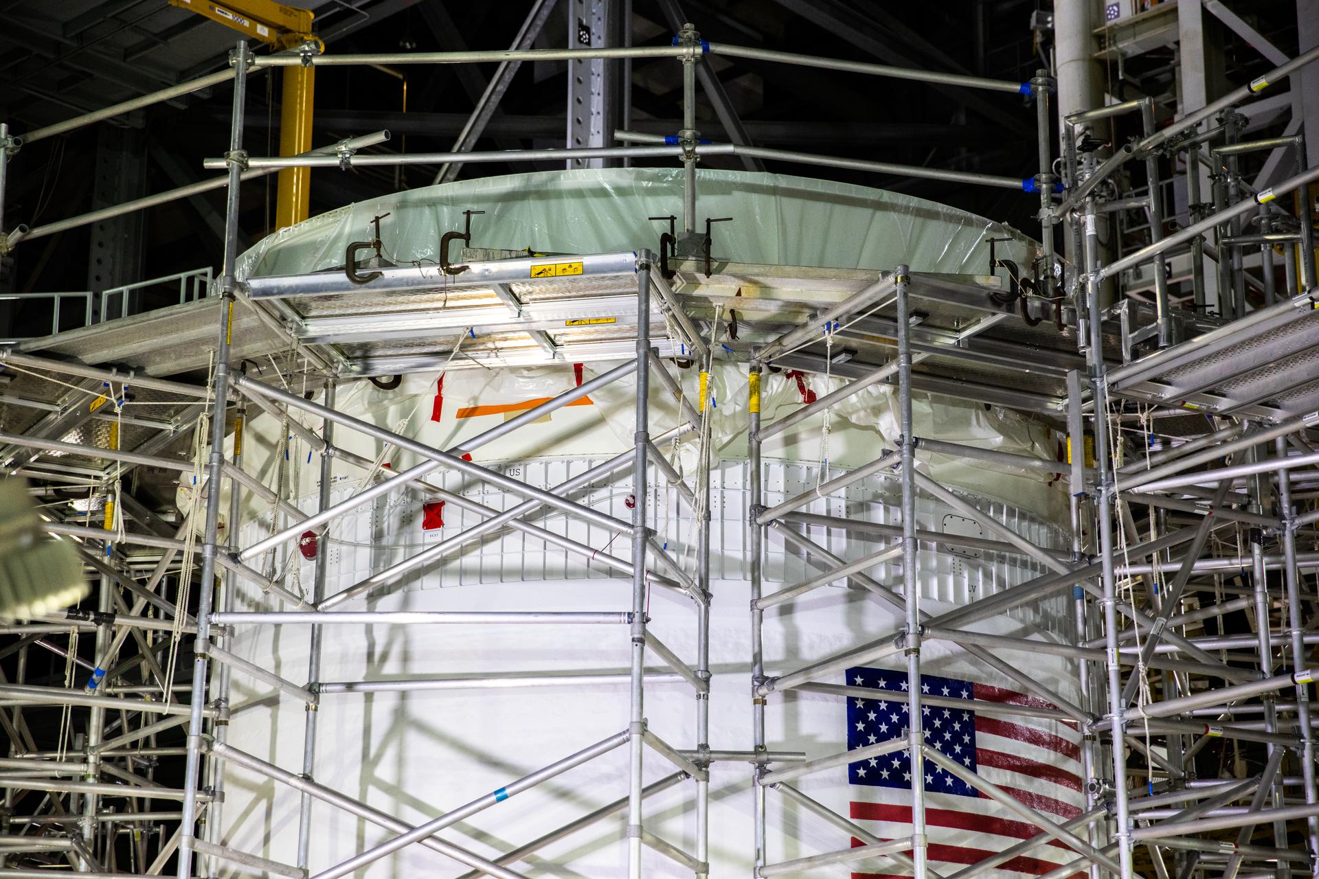 Seen here is a close-up view of the Orion stage adapter (OSA) structural test article atop the Space Launch System (SLS) rocket inside the Vehicle Assembly Building (VAB) at NASA’s Kennedy Space Center in Florida on Aug. 12, 2021. The test article, representing the mass and weight of the actual flight hardware, is being used for various tests inside the VAB ahead of OSA stacking operations. The first in an increasingly complex set of missions, Artemis I will test SLS and the Orion spacecraft as an integrated system prior to crewed flights to the Moon. Through Artemis, NASA will send the first woman and the first person of color to the lunar surface, as well as establish a sustainable presence on and around the Moon.