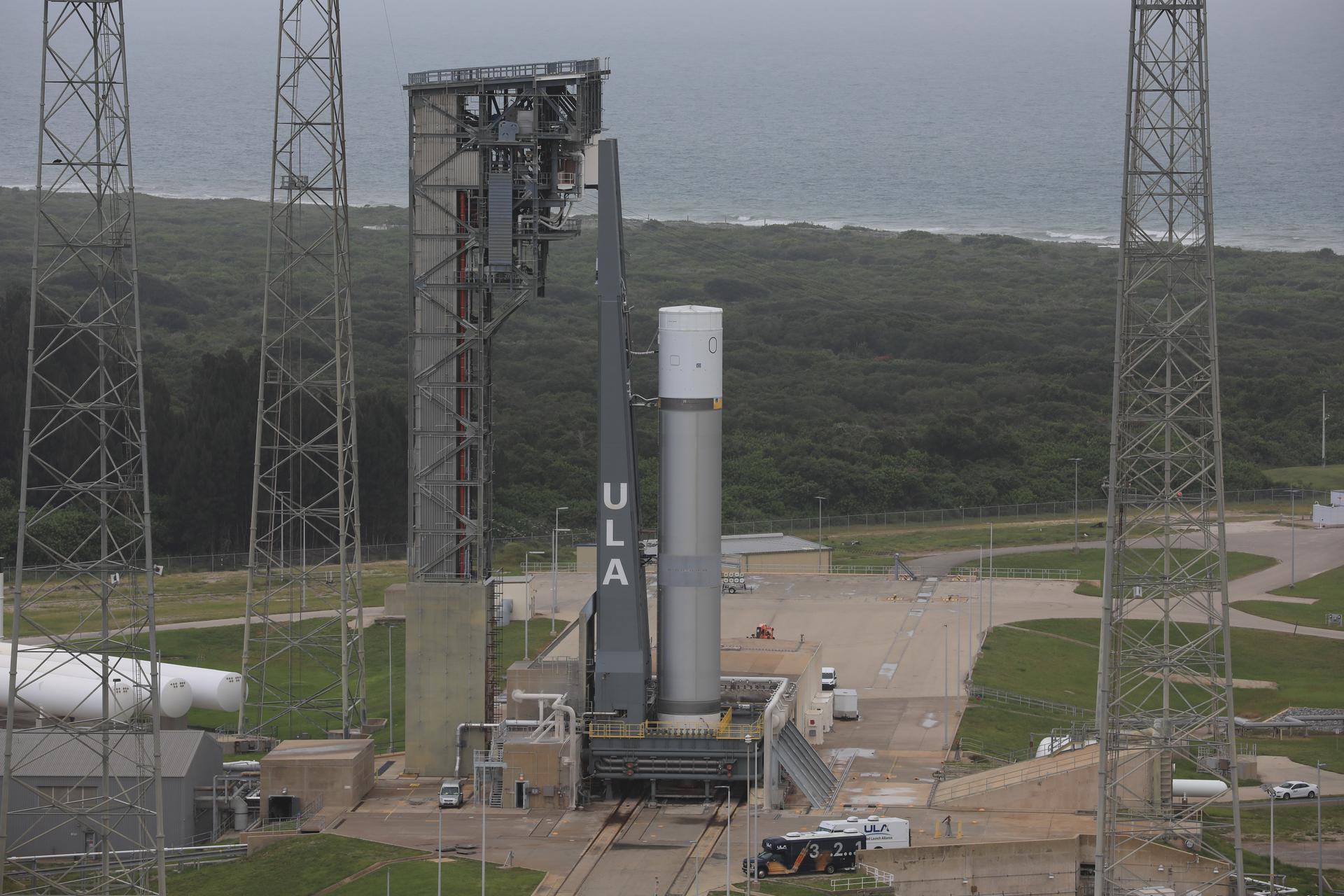A pathfinder test article of United Launch Alliance’s (ULA) Vulcan Centaur rocket is seen at Space Launch Complex 41 at Cape Canaveral Space Force Station in Florida on Aug. 26, 2021. The pathfinder booster is undergoing a series of fueling tests to validate the infrastructure in place at the launch pad and allow the launch team to rehearse countdown operations before the Vulcan’s first flight.