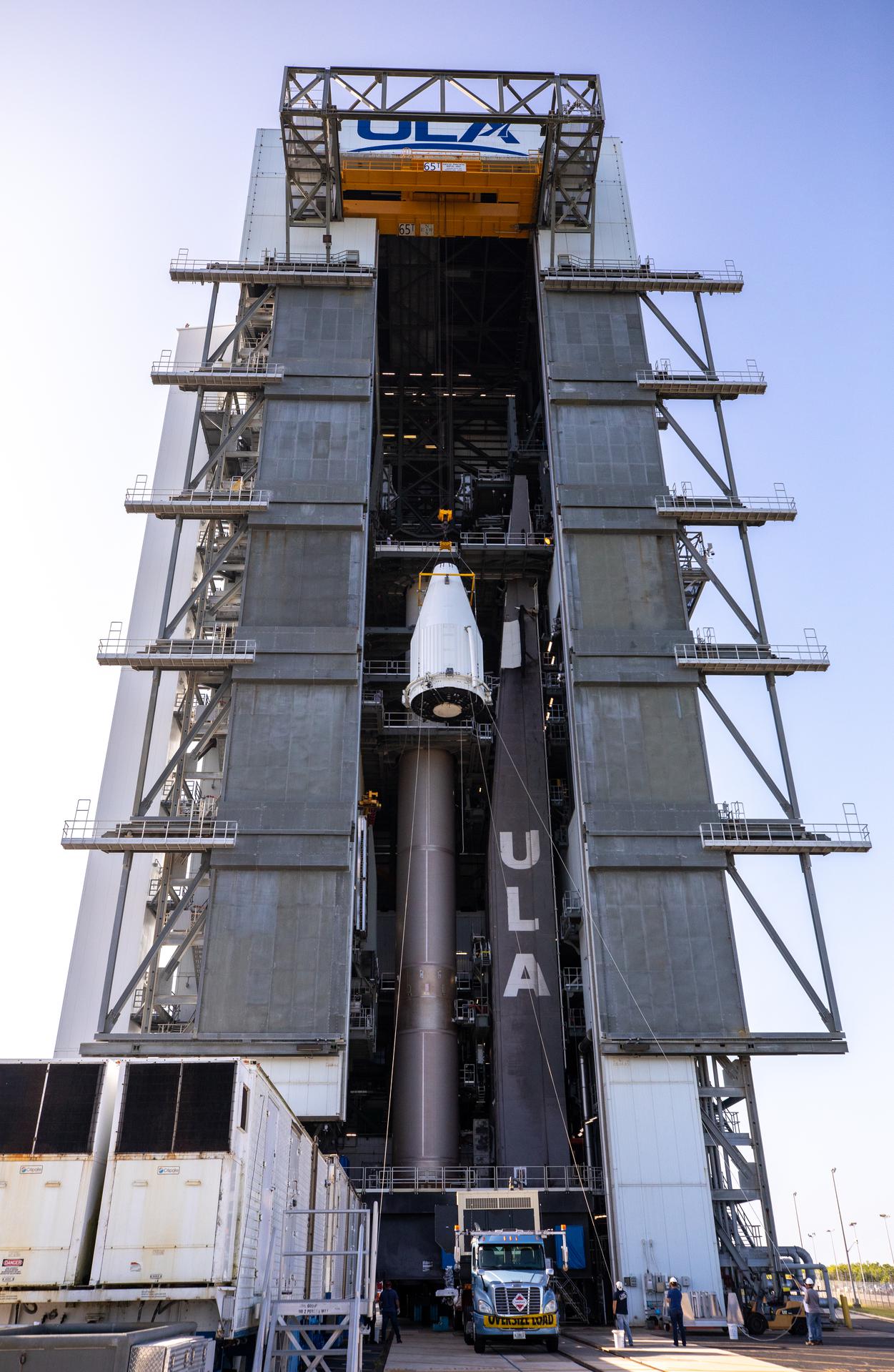 The payload fairing containing NASA’s Lucy spacecraft is hoisted up at the Vertical Integration Facility at Space Launch Complex 41 at Cape Canaveral Space Force Station in Florida on Oct. 7, 2021. It will be lowered onto the United Launch Alliance (ULA) Atlas V Centaur second stage. Lucy is scheduled to launch no earlier than Saturday, Oct. 16, on the ULA Atlas V 401 rocket from Launch Pad 41. NASA’s Launch Services Program, based at Kennedy Space Center, America’s premier multi-user spaceport, is managing the launch. Over its 12-year primary mission, Lucy will explore a record-breaking number of asteroids, flying by one asteroid in the solar system’s main belt and seven Trojan asteroids. Additionally, Lucy’s path will circle back to Earth three times for gravity assists, making it the first spacecraft ever to return to the vicinity of Earth from the outer solar system.