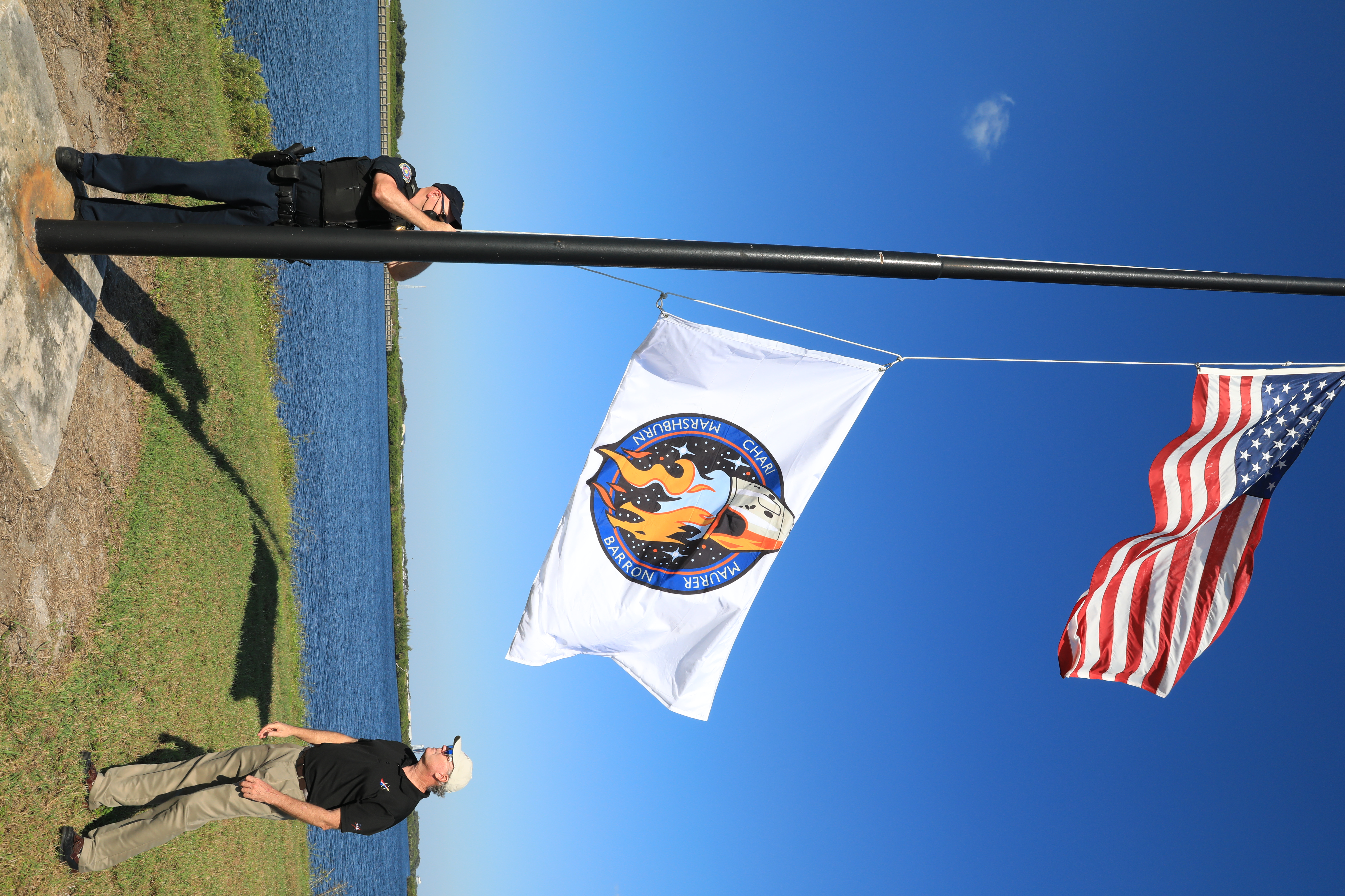 The SpaceX Crew-3 flag is raised below the American flag near the News Center countdown clock at NASA’s Kennedy Space Center in Florida on Oct. 26, 2021. The SpaceX Falcon 9 with Crew Dragon atop is scheduled to launch no earlier than Nov. 6, at 11:36 p.m. EDT from Launch Complex 39A at Kennedy. Crew Dragon will carry four astronauts to the International Space Station for NASA’s Commercial Crew Program. Crew-3 is the third crew rotation flight to the space station, and the first flight of a new Crew Dragon spacecraft.