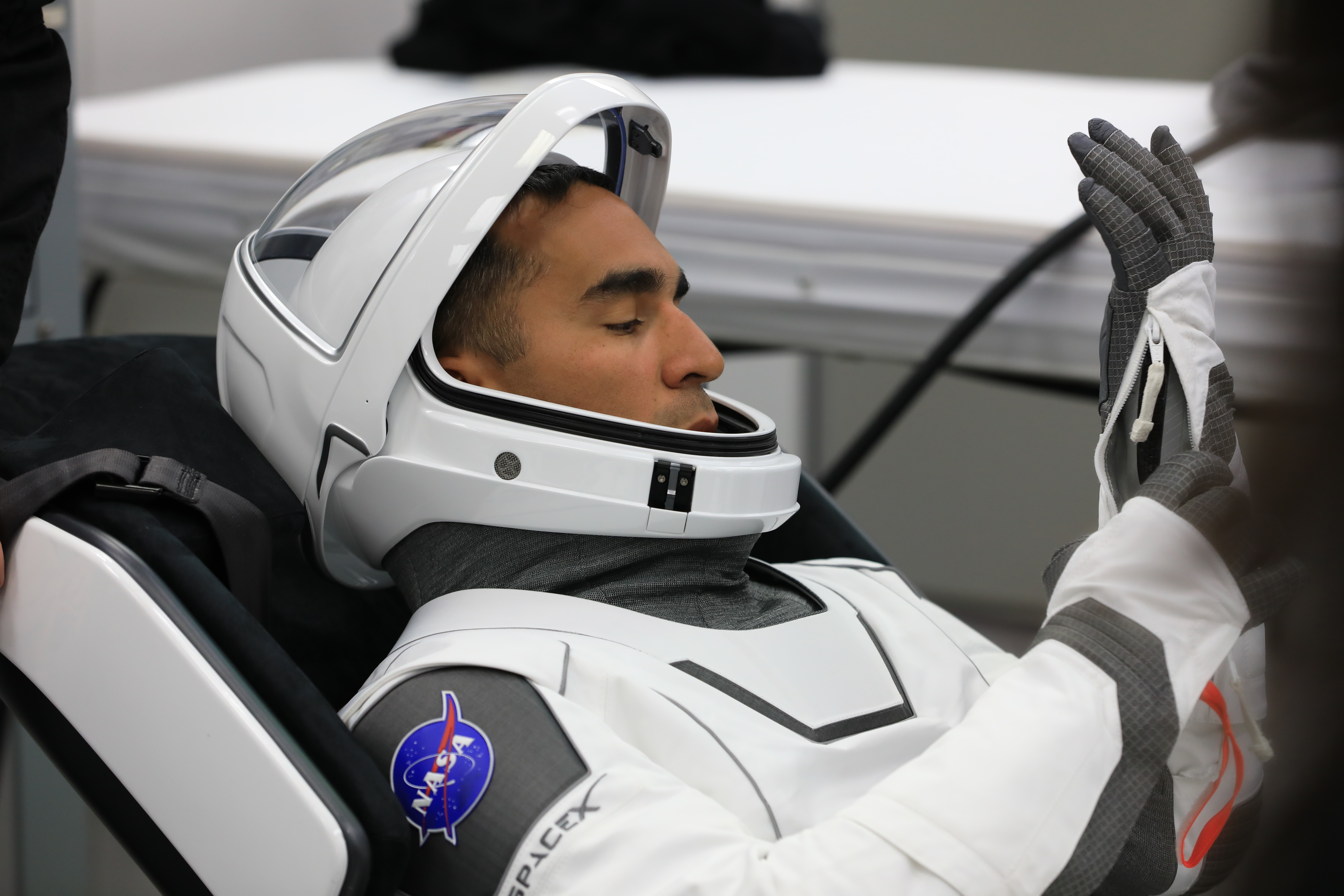 NASA’s SpaceX Crew-3 astronauts participate in a countdown dress rehearsal at the agency’s Kennedy Space Center in Florida on Oct. 28, 2021, to prepare for the upcoming Crew-3 launch. Raja Chari, commander, runs through checkouts of his SpaceX spacesuit inside the crew suitup room in the Neil A. Armstrong Operations and Checkout Building. Chari, along with NASA astronauts Tom Marshburn, pilot, Kayla Barron, mission specialist, and European Space Agency astronaut Matthias Maurer, also a mission specialist, will launch aboard the Crew Dragon atop the Falcon 9 to the International Space Station. Launch is targeted for no earlier than Nov. 6 at 11:36 p.m. EDT from Launch Complex 39A. Crew-3 is the third crew rotation flight to the space station for NASA’s Commercial Crew Program, and the first flight of a new Crew Dragon spacecraft.